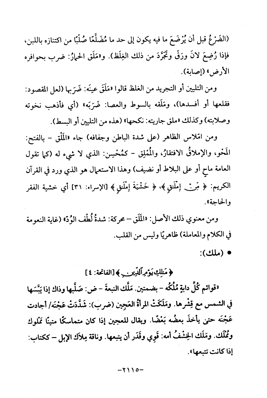 "قوائم كُلِّ دابةٍ مُلُكه -بضمتين مَلَّك النبعةَ- ض: صَلَّبها وذاك إذا يَبّسَها في الشمس مع قِشْرها. ومَلَكَتْ المرأةُ العَجين (ضرب): شَدّدَتْ عَجنَه أجادت عَجْنَه حتى يأخذَ بعضُه بَعضًا. ويقال للعجين إذا كان متماسكًا متينًا مملوك ومُمْلَك. ومَلَك الخِشْفُ أمه: قَوي وقَدَر أن يتبعها. وناقة مِلاك الإبل- ككتاب: إذا كانت تتبعها ".