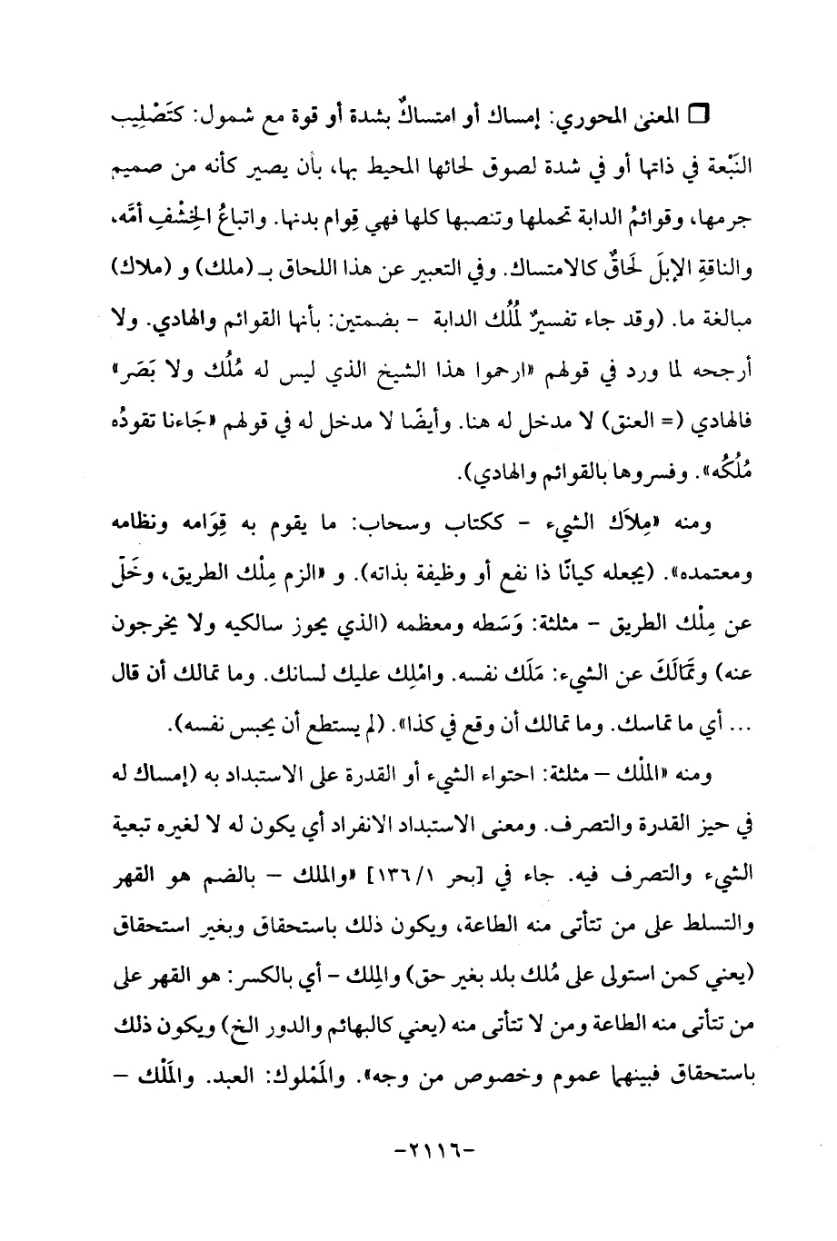 ومنه "الملك- مثلثة: احتواء الشيء أو القدرة على الاستبداد به (إمساك له في حيز القدرة والتصرف. ومعنى الاستبداد الانفراد أي يكون له لا لغيره تبعية الشيء والتصرف فيه. جاء في [بحر 1/ 136] "والملك- بالضم هو القهر والتسلط على من تتأتى منه الطاعة، ويكون ذلك باستحقاق وبغير استحقاق (يعني كمن استولى على ملك بلد بغير حق) والمِلك -أي بالكسر: هو القهر على من تتأتى منه الطاعة ومن لا تتأتى منه (يعني كالبهائم والدور الخ) ويكون ذلك باستحقاق فبينهما عموم وخصوص من وجه ". والمَملوك: العبد. والمَلْك-