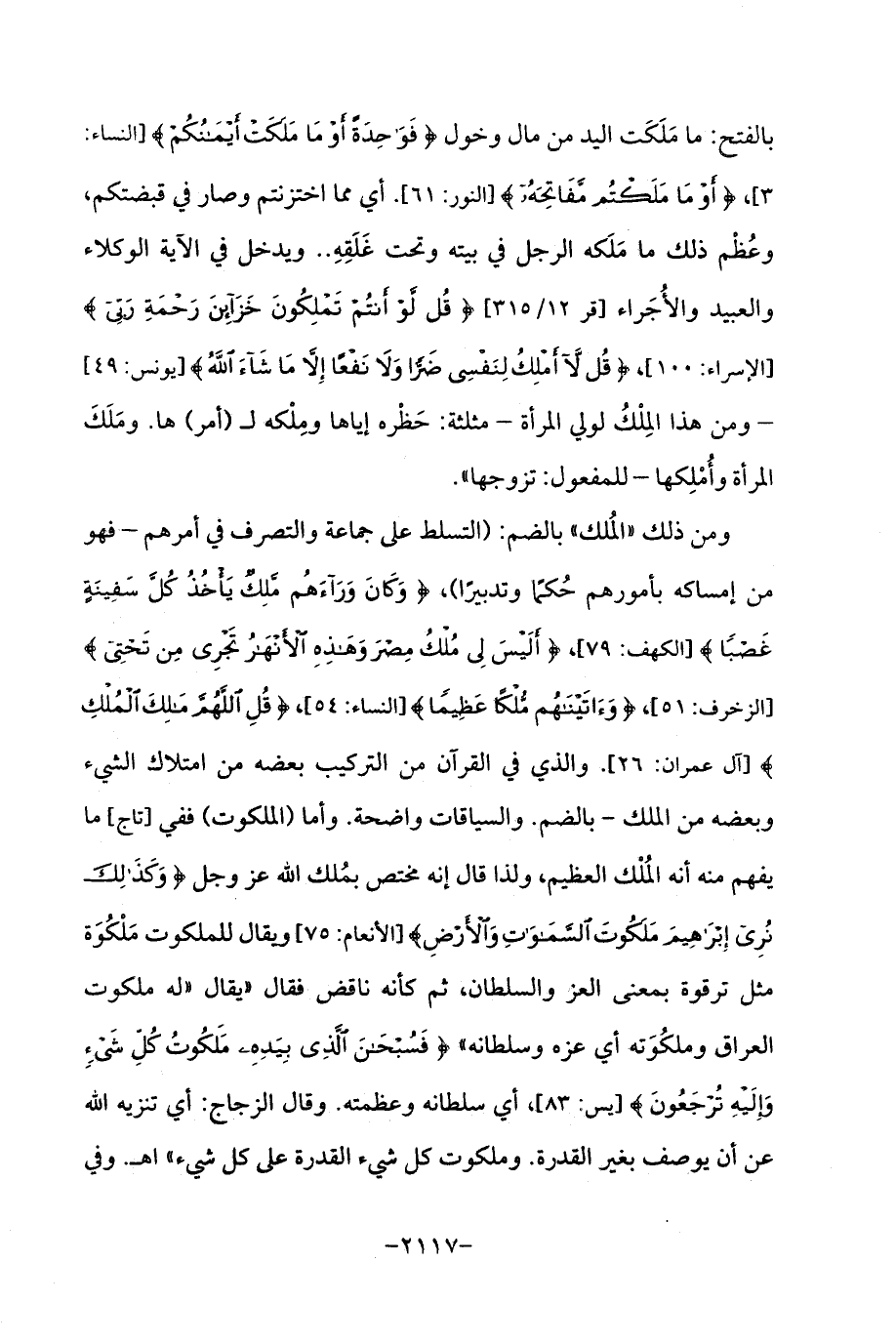 ومن ذلك "المُلك "بالضم: (التسلط على باعة والتصرف في أمرهم -فهو من إمساكه بأمورهم حُكمًا وتدبيرًا)، {وَكَانَ وَرَاءَهُمْ مَلِكٌ يَأْخُذُ كُلَّ سَفِينَةٍ غَصْبًا} [الكهف: 79]، {أَلَيسَ لِي مُلْكُ مِصْرَ وَهَذِهِ الْأَنْهَارُ تَجْرِي مِنْ تَحْتِي} [الزخرف: 51]، {وَآتَينَاهُمْ مُلْكًا عَظِيمًا} [النساء: 54]، {قُلِ اللَّهُمَّ مَالِكَ الْمُلْكِ} [آل عمران: 26]. والذي في القرآن من التركيب بعضه من امتلاك الشيء وبعضه من الملك- بالضم. والسياقات واضحة. وأما (الملكوت) ففي [تاج] ما يفهم منه أنه المُلْك العظيم، ولذا قال إنه مختص بمُلك الله عزَّ وجلَّ {وَكَذَلِكَ نُرِي إِبْرَاهِيمَ مَلَكُوتَ السَّمَاوَاتِ وَالْأَرْضِ} [الأنعام: 75] ويقال للملكوت مَلكُوَة مثل ترقوة بمعنى العز والسلطان، ثم كأنه ناقض فقال "يقال "له ملكوت العراق وملكُوَته أي عزه وسلطانه " {فَسُبْحَانَ الَّذِي بِيَدِهِ مَلَكُوتُ كُلِّ شَيءٍ وَإِلَيهِ تُرْجَعُونَ} [يس: 83]، أي سلطانه وعظمته. وقال الزجاج: أي تنزيه الله عن أن يوصف بغير القدرة. وملكوت كل شيء القدرة على كل شيء "اهـ. وفي