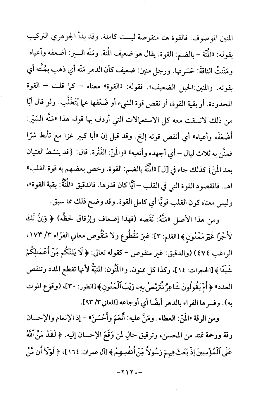 المنين الموصوف. فالقوة هنا منقوصة ليست كاملة. وقد بدأ الجوهري التركيب بقوله: "المُنّة -بالضم: القوة. يقال هو ضعيف المُنة. ومَنّه السير: أضعفه وأعياه. ومَنَنتُ الناقةَ: حَسَرتها. ورجل منين: ضعيف كأن الدهر منه أي ذهب بمُنَّته أي بقوته. والمنين: الحبل الضعيف ". فقوله: "القوة "معناه -كما قلت- القوة المحدودة. أو بقية القوة، أو نقص قوة الشيء أو ضَعْفها عما يُتَطَلّب. ولو قال أيًّا من ذلك لاتسقت معه كل الاستعمالات التي أردف بها قوله هذا "مَنَّه السَيْر: أَضْعَفَه وأعياه "أي أنقص قوته إلخ. وقد قيل إن "أبا كبير غزا مع تأبط شرًّا فمنّن به ثلاث ليال -أي أجهده وأتعبه ""والمَنّ: الفَتْرة. قال: [قد ينشط الفتيان بعد المَنّ] كذلك جاء في [ل] "المُنَّة بالضم: القوة. وخص بعضهم به قوة القلب "اهـ. فالمقصود القوة التي في القلب -أيًّا كان قدرها. فالدقيق "المُنَّة بقية القوة "، وليس معناه كون القلب قويًّا أي كامل القوة. وقد وضح ذلك مما سبق.