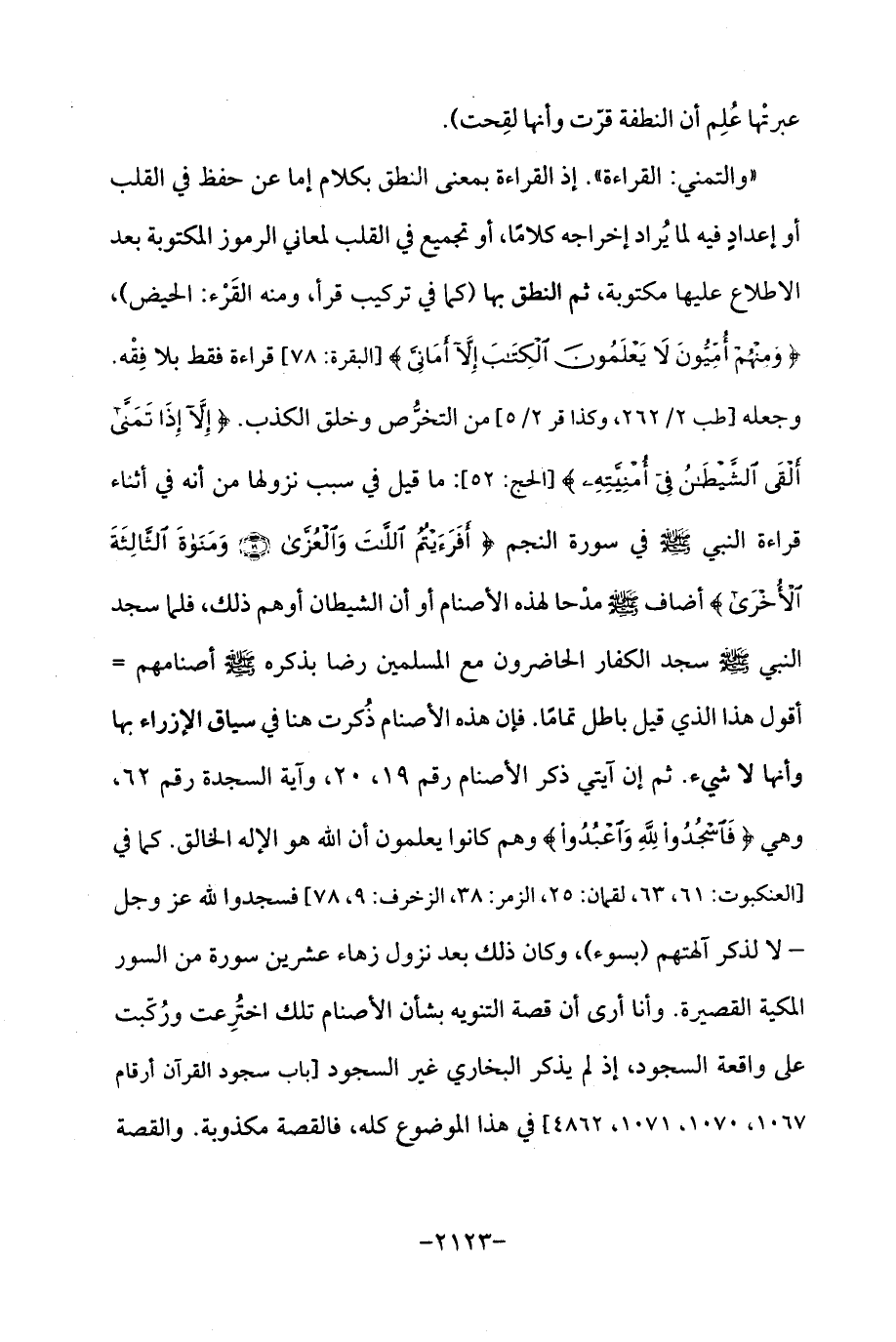 "والتمني: القراءة ". إذ القراءة بمعنى النطق بكلام إما عن حفظ في القلب أو إعدادٍ فيه لما يُراد إخراجه كلامًا، أو تجميع في القلب لمعاني الرمرز المكتوبة بعد الاطلاع عليها مكتوبة، ثم النطق بها (كما في تركيب قرأ، ومنه القَرْء: الحيض)، {وَمِنْهُمْ أُمِّيُّونَ لَا يَعْلَمُونَ الْكِتَابَ إلا أَمَانِيَّ} [البقرة: 78] قراءة فقط بلا فِقْه. وجعله [طب 2/ 262، وكذا قر 2/ 5] من التخرُّص وخلق الكذب. {إلا إِذَا تَمَنَّى أَلْقَى الشَّيطَانُ فِي أُمْنِيَّتِهِ} [الحج: 52]: ما قيل في سبب نزولها من أنه في أثناء قراءة النبي - صلى الله عليه وسلم - في سورة النجم {أَفَرَأَيتُمُ اللَّاتَ وَالْعُزَّى (19) وَمَنَاةَ الثَّالِثَةَ الْأُخْرَى} أضاف - صلى الله عليه وسلم - مدْحا لهذه الأصنام أو أن الشيطان أوهم ذلك، فلما سجد النبي - صلى الله عليه وسلم - سجد الكفار الحاضرون مع المسلمين رضا بذكره - صلى الله عليه وسلم - أصنامهم= أقول هذا الذي قيل باطل تمامًا. فإن هذه الأصنام ذُكرت هنا في سياق الإزراء بها وأنها لا شيء. ثم إن آيتي ذكر الأصنام رقم 19، 20، وآية السجدة رقم 62، وهي {فَاسْجُدُوا لِلَّهِ وَاعْبُدُوا} وهم كانوا يعلمون أن الله هو الإله الخالق. كما في [العنكبوت: 61، 63، لقمان: 25، الزمر: 38، الزخرف: 9، 78] فسجدوا لله عزَّ وجلَّ - لا لذكر آلهتهم (بسوء)، وكان ذلك بعد نزول زهاء عشرين سورة من السور المكية القصيرة. وأنا أرى أن قصة التنويه بشأن الأصنام تلك اختُرِعت ورُكَبت على واقعة السجود، إذ لم يذكر البخاري غير السجود [باب سجود القرآن أرقام 1067، 1070، 1071، 4862] في هذا الموضوع كله، فالقصة مكذوبة. والقصة