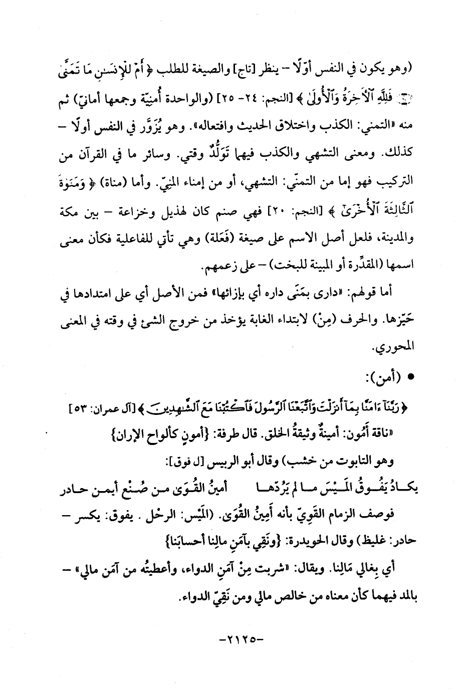 (وهو يكون في النفس أوّلًا- ينظر [تاج] والصيغة للطلب {أَمْ لِلْإِنْسَانِ مَا تَمَنَّى (24) فَلِلَّهِ الْآخِرَةُ وَالْأُولَى} [النجم: 24 - 25] (والواحدة أُمنِيّة وجمعها أمانيّ) ثم منه "التمني: الكذب واختلاف الحديث وافتعاله ". وهو يُزَوَّر في النفس أولًا- كذلك. ومعنى التشهي والكذب فيهما تَوَلُّدٌ وقتي. وسائر ما في القرآن من التركيب فهو إما من التمنّي: التشهي، أو من إمناء المنيّ. وأما (مناة) {وَمَنَاةَ الثَّالِثَةَ الْأُخْرَى} [النجم: 20] فهي صنم كان لهذيل وخزاعة- بين مكة والمدينة، فلعل أصل الاسم على صيغة (فَعَلة) وهي تأتي للفاعلية فكأن معنى اسمها (المقدَّرة أو المبينة للبخت) - على زعمهم.
