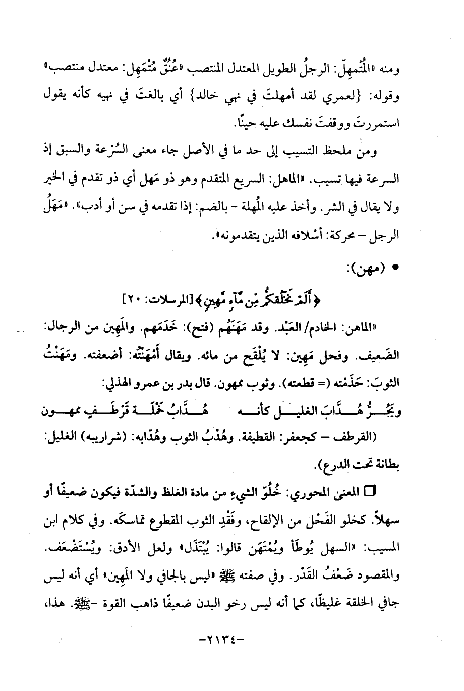 Qخُلُوّ الشيءِ من مادة الغلظ والشدّة فيكون ضعيفًا أو سهلًا. كخلو الفَحْل من الإلقاح، وفَقْدٍ الثوب المقطوع تماسكَه. وفي كلام ابن الهسيب: "السهل يُوطَأ ويُمْتَهَن قالوا: يُبْتَذَل "ولعل الأدق: ويُستَضْعَف. والمقصود ضَعْفُ القَدْر. وفي صفته - صلى الله عليه وسلم - "ليس بالجافي ولا المَهِين "أي أنه ليس جافي الخلقة غليظًا، كما أنه ليس رخو البدن ضعيفًا ذاهب القوة - صلى الله عليه وسلم -. هذا،