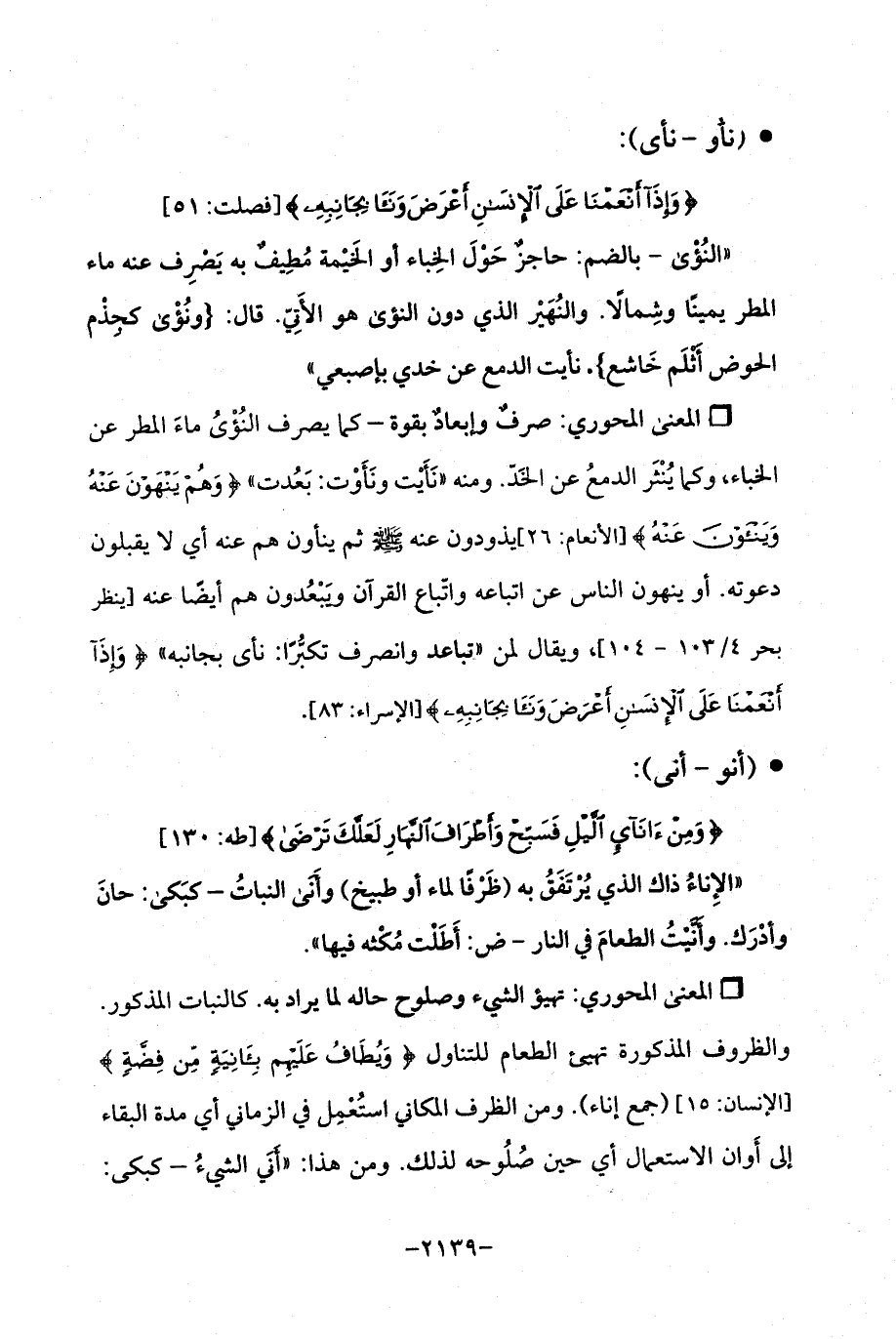 Qصرفٌ وإبعادٌ بقوة -كما يصرف النُؤْىُ ماءَ المطر عن الخباء، وكما يُنثَر الدمعُ عن الخَدّ. ومنه "نَأَيت ونَأَوْت: بَعُدت " {وَهُمْ يَنْهَوْنَ عَنْهُ وَيَنْأَوْنَ عَنْهُ} [الأنعام: 26] يذودون عنه - صلى الله عليه وسلم - ثم ينأون هم عنه أي لا يقبلون دعوته. أو ينهون الناس عن اتباعه واتّباع القرآن وَيبْعُدون هم أيضًا عنه [ينظر بحر 4/ 103 - 104]، ويقال لمن "تباعد وانصرف تكبُّرًا: نأى بجانبه " {وَإِذَا أَنْعَمْنَا عَلَى الْإِنْسَانِ أَعْرَضَ وَنَأَى بِجَانِبِهِ} [الإسراء: 83].