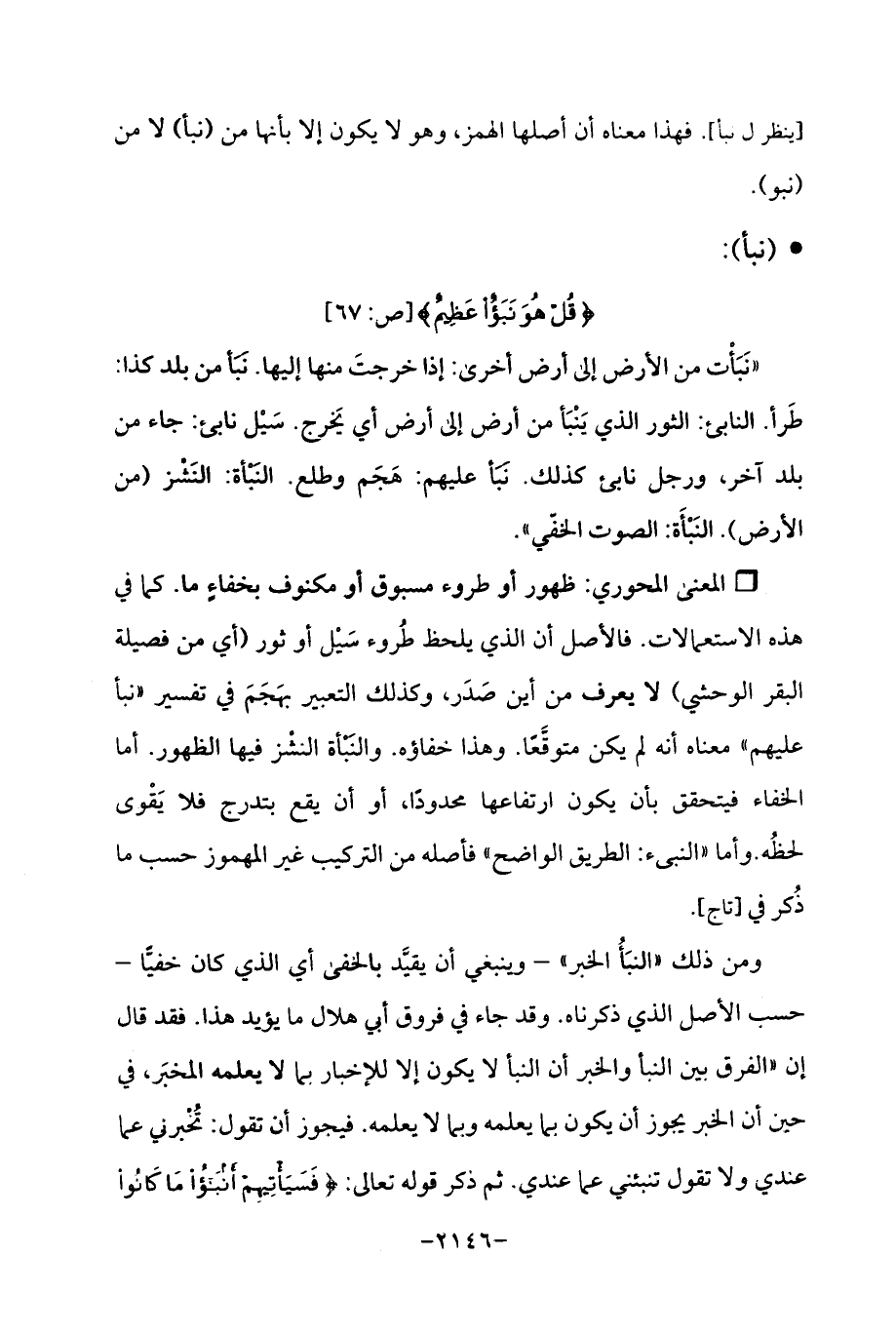 [ينظر ل نبأ]. فهذا معناه أن أصلها الهمز، وهو لا يكون إلا بأنها من (نبأ) لا من (نبو).