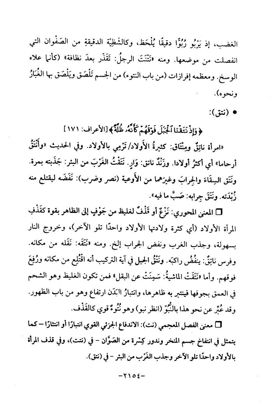 Qنَزْعٌ أو قَذْفٌ لغليظ من جَوْفٍ إلى الظاهر بقوة كقَذْفِ المرأة الأولاد (أي كثرة ولادتها الأولاد واحدًا تلو الآخر)، وخروج النار بسهولة، وجذب الغرب ونفض الجراب إلخ. ومنه (نَتَقَه: نَقَله من مكانه. وفرس ناتِقٌ: ينفُضُ راكبَه. ونَتْقُ الجبل في آية التركيب أنه اقتُلِع من مكانه ورُفِعَ فوقهم. وأما "نَتَقَتْ الماشيةُ: سَمِنَتْ عن البقل "فمن تكون الغليظ وهو الشحم في العمق بجوفها فينتبر به ظاهرها، وانتبارُ البَدَن ارتفاع وهو من باب الظهور. وقد عُبِّر عن نحو هذا بالنُّبُوّ (انظر نبو) وهو نُتُوءٌ قوي كالقَذْف.