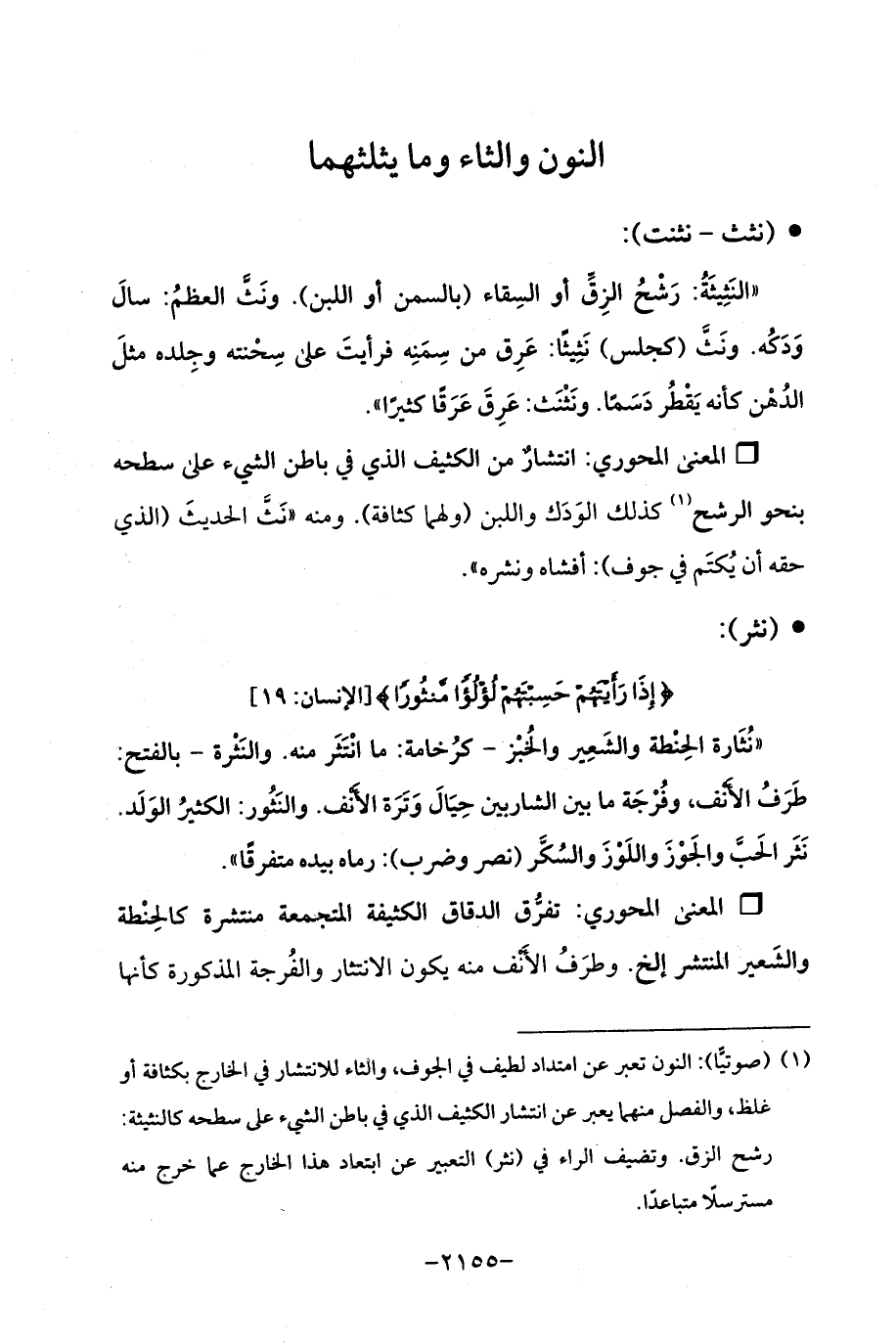 (¬1) (صوتيًّا): النون تعبر عن امتداد لطيف في الجوف، والثاء للانتشار في الخارج بكثافة أو غلظ، والفصل منهما يعبر عن انتشار الكثيف الذي في باطن الشيء على سطحه كالنثيثة: رشح الزق. وتضيف الراء في (نثر) العبير عن ابتعاد هذا الخارج عما خرج منه مسترسلًا متباعدًا.