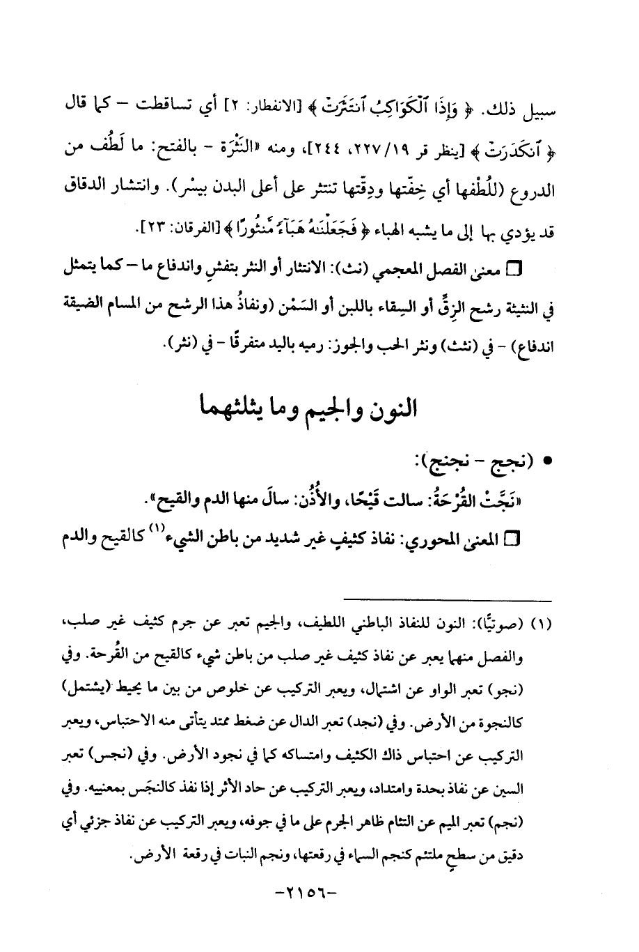 (¬1) (صوتيًّا): النون للنفاذ الباطني اللطيف، والجيم تعبر عن جرم كثيف غير صلب، والفصل منهما يعبر عن نفاذ كثيف غير صلب من باطن شيء كالقيح من القُرحة. وفي (نجو) تعبر الواو عن اشتمال، ويعبر التركيب عن خلوص عن بين ما يحيط (يشتمل) كالنجوة من الأرض. وفي (نجد) تعبر الدال عن ضغط ممتد يتأتى منه الاحتباس، ويعبر التركيب عن احتباس ذاك الكثيف وامتساكه كما في نجود الأرض. وفي (نجس) تعبر السين عن نفاذ بحدة وامتداد، ويعبر التركيب عن حاد الأثر إذا نفذ كالنجَس بمعنييه. وفي (نجم) تعبر الميم عن التئام ظاهر الجرم على ما في جوفه، ويعبر التركيب عن نفاذ جزئي أي دقيق من سطحٍ ملتئم كنجم الماء في رقعتها، ونجم النبات في رقعة الأرض.