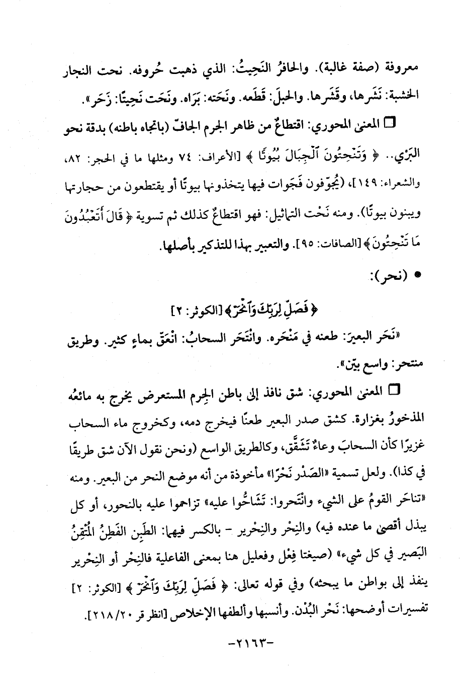 Qشق نافذ إلى باطن الجِرم المستعرض يخرج به مائعُه المذخورُ بغزارة. كشق صدر البعير طعنًا فيخرج دمه، وكخروج ماء السحاب غزيرًا كأن السحابَ وعاءٌ تَشَقَّق، وكالطريق الواسع (ونحن نقول الآن شق طريقًا في كذا). ولعل تسمية "الصَدْر نَحْرًا "مأخوذة من أنه موضع الخير من البعير. ومنه "تناحَر القومُ على الشيء وانْتَحروا: تَشَاحُّوا عليه "تزاحموا عليه بالنحور، أو كل يبذل أقصى ما عنده فيه) والنِحْر والنِحْرير - بالكسر فيهما: الطَبِن الفَطِنُ المُتْقِنُ البَصير في كل شيء " (صيغتا فِعْل وفعليل هنا بمعى الفاعلية فالنِحْر أو النِحْرير ينفذ إلى بواطن ما يبحثه) وفي قوله تعالى: {فَصَلِّ لِرَبِّكَ وَانْحَرْ (2)} [الكوثر: 2] تفسيرات أوضحها: نَحْر البُدْن. وأنسبها وألطفها الإخلاص [انظر قر 20/ 218].