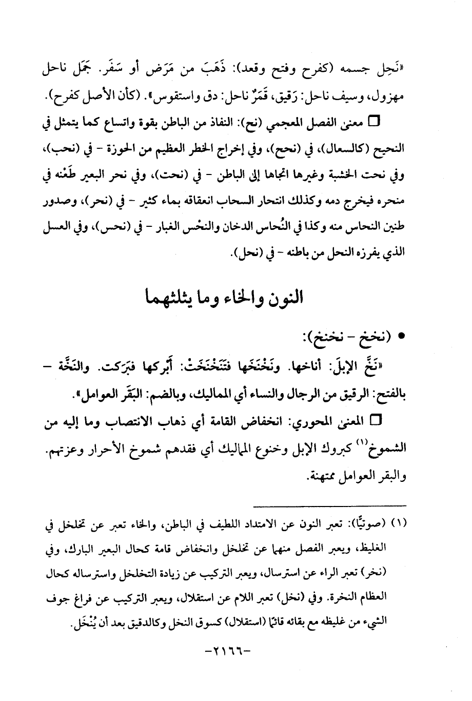 ° معنى الفصل المعجمي (نح): النفاذ من الباطن بقوة واتساع كما يتمثل في النحيح (كالسعال)، في (نحح)، وفي إخراج الخطر العظيم من الحوزة- في (نحب)، وفي نحت الخشبة وغيرها اتجاها إلى الباطن- في (نحت)، وفي نحر البعير طَعْنه في منحره فيخرج دمه وكذلك انتحار السحاب انعقاقه بماء كثير- في (نحر)، وصدور طنين النحاس منه وكذا في النُحاس الدخان والنخس الغبار- في (نحس)، وفي العسل الذي يفرزه النحل من باطنه- في (نحل).