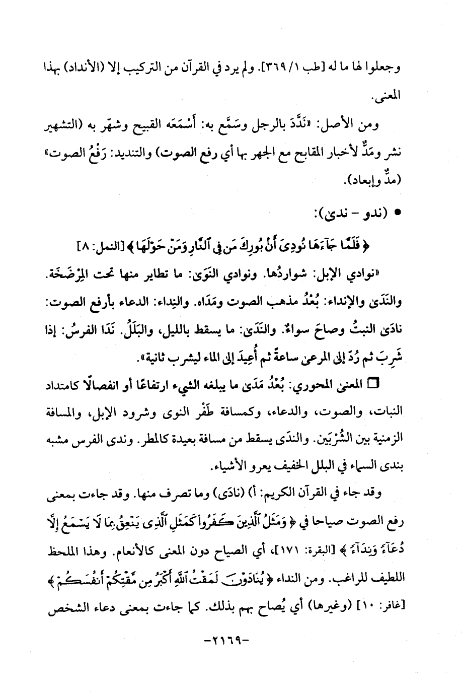 وقد جاء في القرآن الكريم: أ) (نادَى) وما تصرف منها. وقد جاءت بمعنى رفع الصوت صياحا في {وَمَثَلُ الَّذِينَ كَفَرُوا كَمَثَلِ الَّذِي يَنْعِقُ بِمَا لَا يَسْمَعُ إلا دُعَاءً وَنِدَاءً} [البقرة: 171]، أي الصياح دون المعنى كالأنعام. وهذا الملحظ اللطيف للراغب. ومن النداء {يُنَادَوْنَ لَمَقْتُ اللَّهِ أَكْبَرُ مِنْ مَقْتِكُمْ أَنْفُسَكُمْ} [غافر: 10] (وغيرها) أي يُصاح بهم بذلك. كما جاءت بمعنى دعاء الشخص
