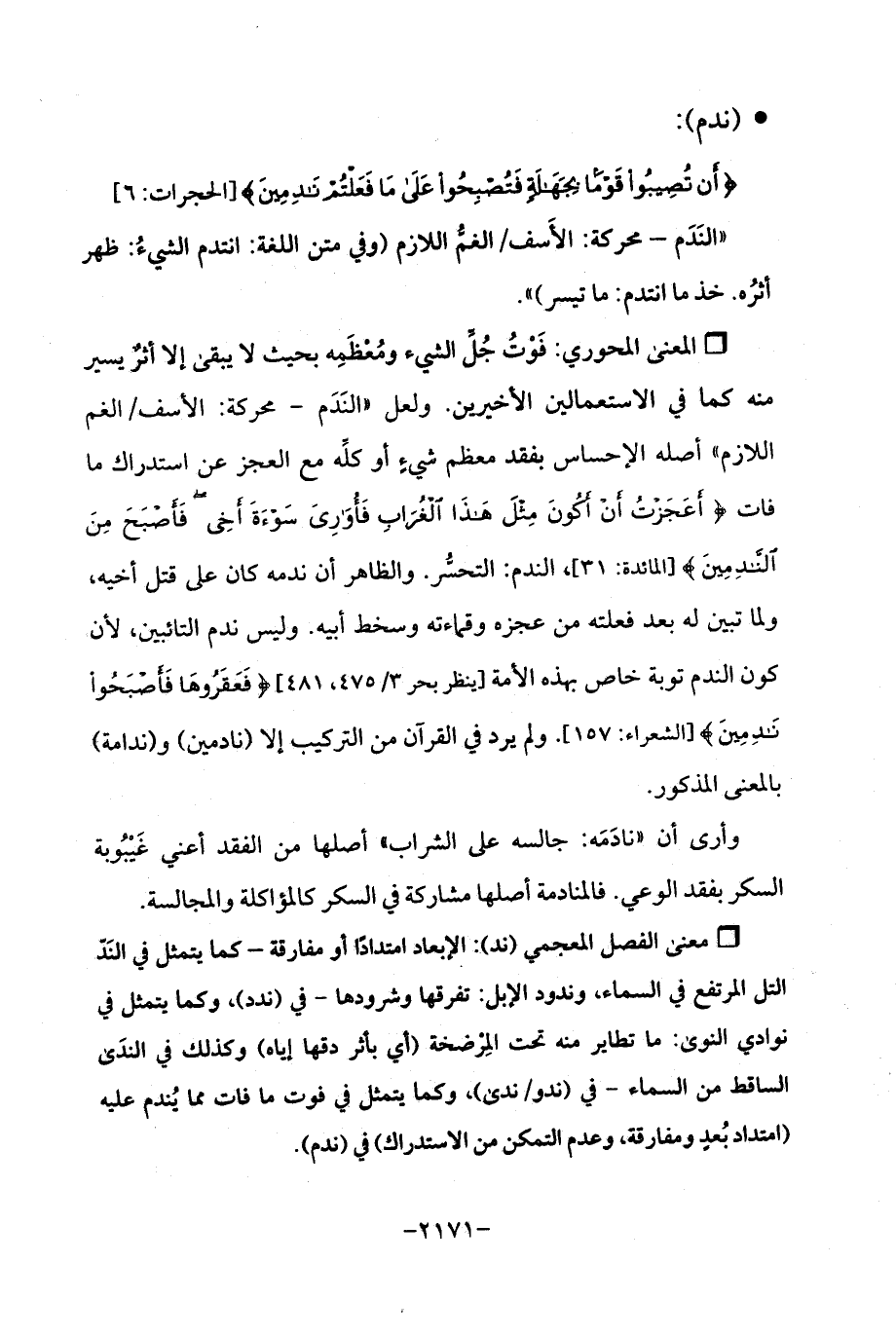 Qفَوْتُ جُلِّ الشيء ومُعْظَمِه بحيث لا يبقى إلا أثرٌ يسير منه كما في الاستعمالين الأخيرين. ولعل "النَدَم- محركة: الأسف / الغم اللازم "أصله الإحساس بفقد معظم شيءٍ أو كلِّه مع العجز عن استدراك ما فات {أَعَجَزْتُ أَنْ أَكُونَ مِثْلَ هَذَا الْغُرَابِ فَأُوَارِيَ سَوْءَةَ أَخِي فَأَصْبَحَ مِنَ النَّادِمِينَ} [المائدة: 31]، الندم: التحسُّر. والظاهر أن ندمه كان على قتل أخيه، ولما تبين له بعد فعلته من عجزه وقماءته وسخط أبيه. وليس ندم التائبين، لأن كون الندم توبة خاص بهذه الأمة [ينظر بحر 3/ 475، 481] {فَعَقَرُوهَا فَأَصْبَحُوا نَادِمِينَ} [الشعراء: 157]. ولم يرد في القرآن من التركيب إلا (نادمين) و (ندامة) بالمعنى المذكور.