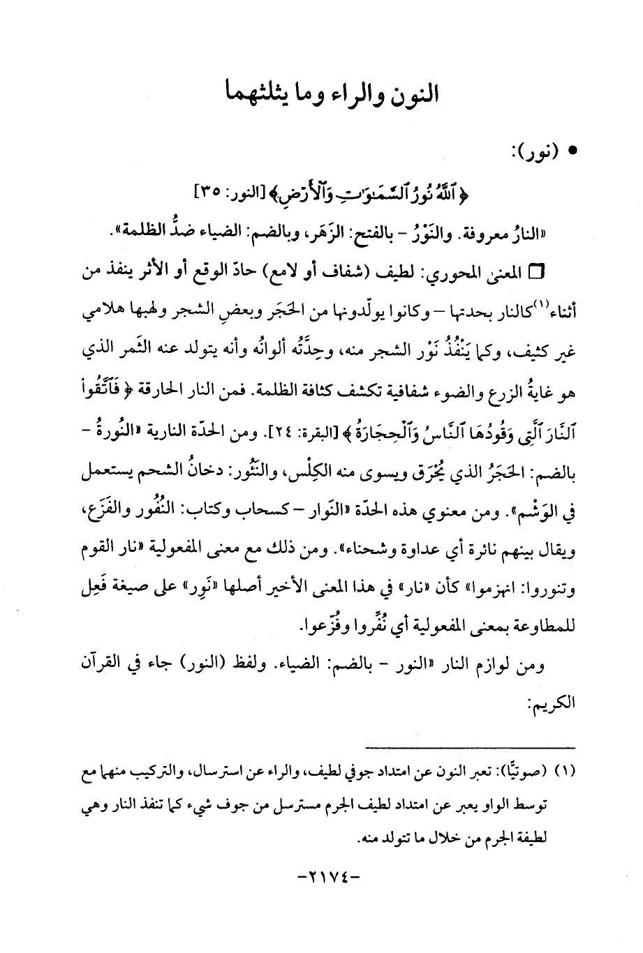 (¬1) (صوتيًّا): تعبر النون عن امتداد جوفي لطيف، والراء عن استرسال، والتركيب منهما مع توسط الواو يعبر عن امتداد لطيف الجرم مسترسل من جوف شيء كما تنفذ النار وهي لطيفة الجرم من خلال ما تتولد منه.