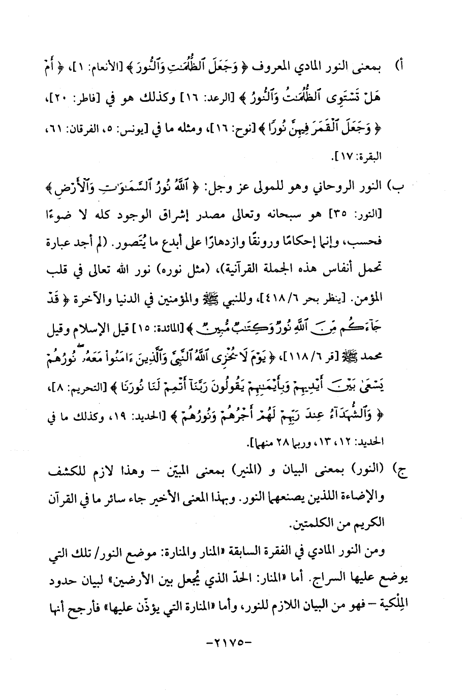 أ) بمعنى النور المادي المعروف {وَجَعَلَ الظُّلُمَاتِ وَالنُّور} [الأنعام: 1]، {أَمْ هَلْ تَسْتَوي الظُّلُمَاتُ وَالنُّورُ} [الرعد: 16] وكذلك هو في [فاطر: 20]، {وَجَعَلَ الْقَمَرَ فِيهِنَّ نُورًا} [نوح: 16]، ومثله ما في [يونس: 5، الفرقان: 61، البقرة 17].