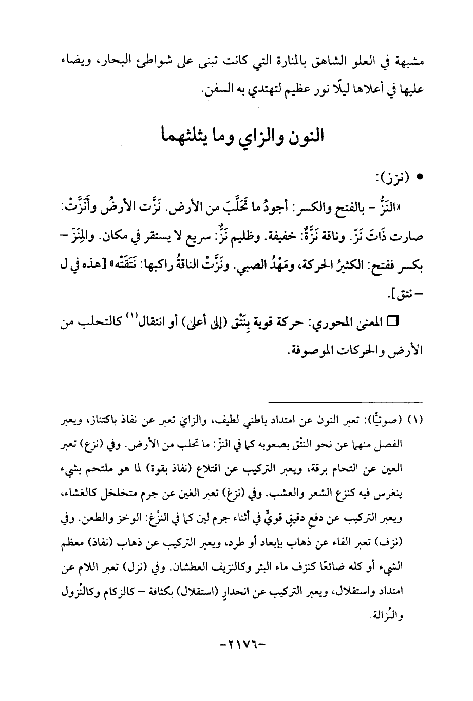 (¬1) (صوتيًّا): تعبر النون عن امتداد باطني لطيف، والزاي تعبر عن نفاذ باكتناز، ويعبر الفصل منهما عن نحو النتْق بصعوبة كما في النز: ما تحلب من الأرض. وفي (نزع) تعبر العين عن التحام برقة، ويعبر التركيب عن اقتلاع (نفاذ بقوة) لما هو ملتحم بشيء ينغرس فيه كنزع الشعر والعشب. وفي (نزغ) تعبر الغين عن جرم متخلخل كالغشاء، ويعبر التركيب عن دفعِ دقيقٍ قويٍّ في أثناء جرم لين كما في النزْغ: الوخز والطعن. وفي (نزف) تعبر الفاء عن ذهاب بإبعاد أو طرد، ويعبر التركيب عن ذهاب (نفاذ) معظم الشيء أو كله ضائعًا كنزف ماء البئر وكالنزيف العطشان. وفي (نزل) تعبر اللام عن امتداد واستقلال، ويعبر التركيب عن انحدارٍ (استقلال) بكثافة- كالزكام وكالنُزول والنُزالة.