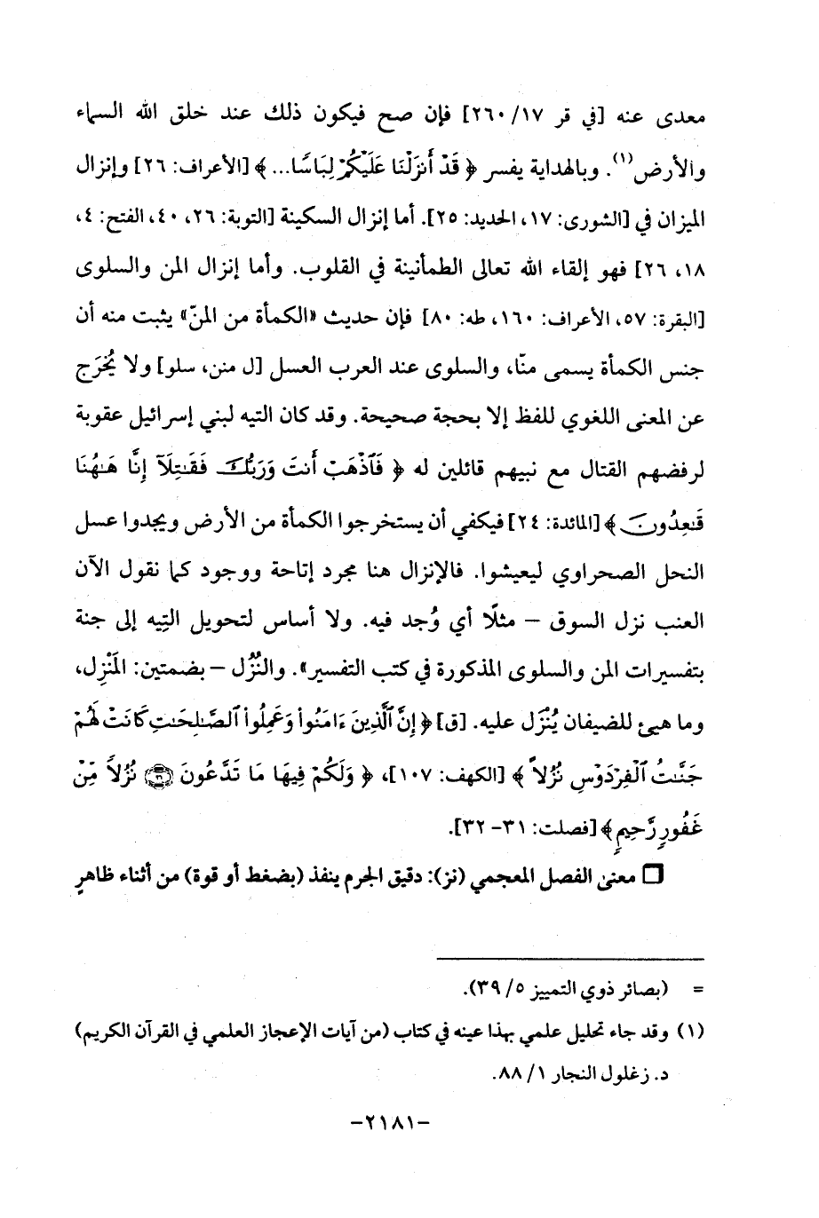 معدى عنه [في قر 17/ 260] فإن صح فيكون ذلك عند خلق الله السماء والأرض (¬1). وبالهداية يفسر {قَدْ أَنْزَلْنَا عَلَيكُمْ لِبَاسًا ...} [الأعراف: 26] وإنزال الميزان في [الشورى: 17، الحديد: 25]. أما إنزال السكينة [التوبة: 26, 40, الفتح: 4, 18، 26] فهو إلقاء الله تعالى الطمأنينة في القلوب. وأما إنزال المن والسلوى [البقرة: 57, الأعراف: 160, طه: 80] فإن حديث "الكمأة من المنّ "يثبت منه أن جنس الكمأة يسمى منًّا، والسلوى عند العرب العسل [ل منن، سلو] ولا يُخرَج عن المعنى اللغوي للفظ إلا بحجة صحيحة. وقد كان التيه لبني إسرائيل عقوبة لرفضهم القتال مع نبيهم قائلين له {فَاذْهَبْ أَنْتَ وَرَبُّكَ فَقَاتِلَا إِنَّا هَاهُنَا قَاعِدُونَ} [المائدة: 24] فيكفي أن يستخرجوا الكمأة من الأرض ويجدوا عسل النحل الصحراوي ليعيشوا. فالإنزال هنا مجرد إتاحة ووجود كما نقول الآن العنب نزل السوق- مثلًا أي وُجد فيه. ولا أساس لتحويل التِّيه إلى جنة بتفسيرات المن والسلوى المذكورة في كتب التفسير ". والنُّزُل -بضمتين: المَنْزِل، وما هيئ للضيفان يُنْزَل عليه. [ق] {إِنَّ الَّذِينَ آمَنُوا وَعَمِلُوا الصَّالِحَاتِ كَانَتْ لَهُمْ جَنَّاتُ الْفِرْدَوْسِ نُزُلًا} [الكهف: 107]، {وَلَكُمْ فِيهَا مَا تَدَّعُونَ (31) نُزُلًا مِنْ غَفُورٍ رَحِيمٍ} [فصلت: 31 - 32].