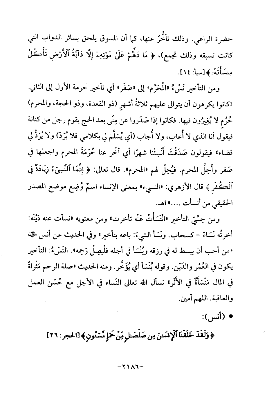 ومن التأخير نَسْءُ "المُحَرَّم "إلى "صَفَر "أي تأخير حرمة الأول إلى الثاني. "كانوا يكرهون أن يتوالى عليهم ثلاثةُ أشهرٍ (ذو القعدة، وذو الحجة، والمحرم) حُرُمٍ لا يُغِيرُون فيها. فكانوا إذا صَدَروا عن مِنًى بعد الحج يقوم رجل من كنانة فيقول أنا الذي لا أُعاب، ولا أُجاب (أي يُسَلَّم لي بكلامي فلا يُرَدّ) ولا يُرَدُّ لي قضاء "فيقولون صَدَقْتَ أنسِئْنا شهرًا أي أخّر عنا حُرْمَةَ المحرم واجعلها في صَفر وأَحِلَّ المحرم. فيُحِلّ لهم "المحرم ". قال تعالى: {إِنَّمَا النَّسِيءُ زِيَادَةٌ فِي الْكُفْرِ} قال الأزهري: "النسئ "بمعنى الإنساء اسمٌ وُضِع موضع المصدر الحقيقي من أنسأت .... "اهـ.