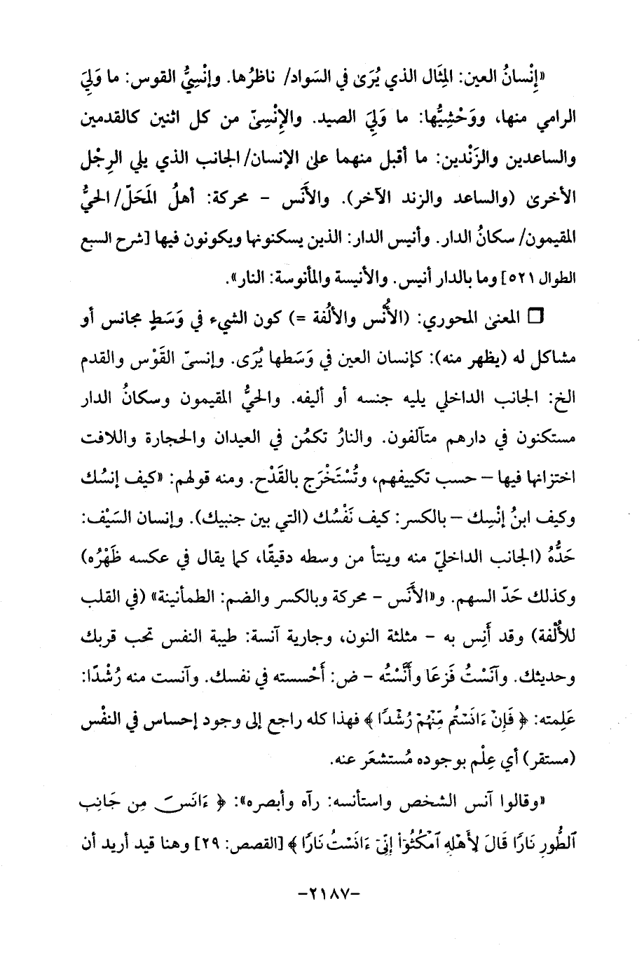 Q(الأُنْس والأُلفة =) كون الشيء في وَسَطٍ مجانس أو مشاكل له (يظهر منه): كإنسان العين في وَسَطها يُرَى. وإنسيّ القَوْس والقدم الخ: الجانب الداخلي يليه جنسه أو أليفه. والحيُّ المقيمون وسكانُ الدار مستكنون في دارهم متآلفون. والنارُ تكمُن في العيدان والحجارة واللافت اختزانها فيها - حسب تكييفهم، وتُسْتَخْرَج بالقَدْح، ومنه قولهم: "كيف إنسُك وكيف ابنُ إنْسِك- بالكسر: كيف نَفْسُك (التي بين جنبيك). وإنسان السَيف: حَدُّهُ (الجانب الداخليّ منه وينتأ من وسطه دقيقًا، كما يقال في عكسه ظَهْرُه) وكذلك حَدّ السهم. و "الأَنَس - محركة وبالكسر والضم: الطمأنينة " (في القلب للأُلفة) وقد أَنِس به- مثلثة النون، وجارية آنسة: طيبة النفس تحب قربك وحديثك. وآنسْتُ فَزعًا وأنَّسْتُه- ض: أحْسسته في نفسك. وآنست منه رُشْدًا: عَلِمته: {فَإِنْ آنَسْتُمْ مِنْهُمْ رُشْدًا} فهذا كله راجع إلى وجود إحساس في النفْس (مستقر) أي عِلْم بوجوده مُستشعَر عنه.
