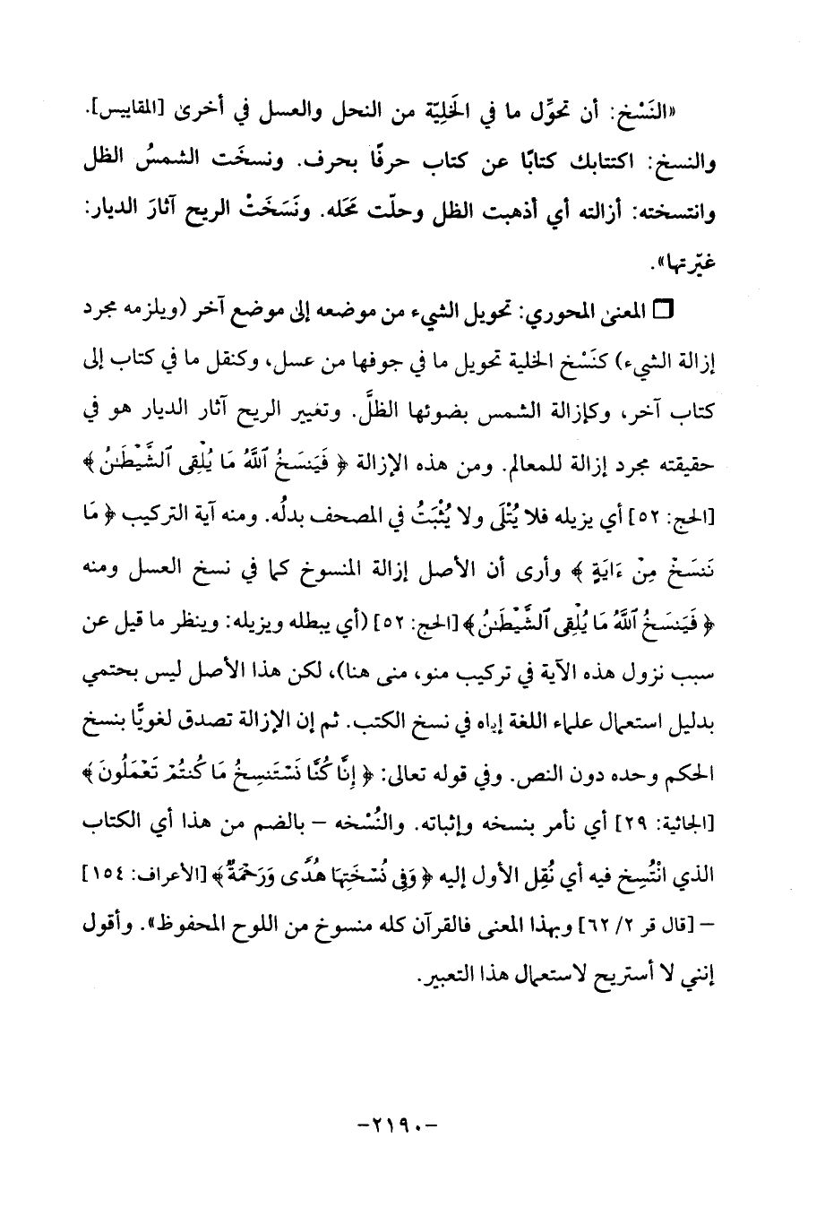 Qتحويل الشيء من موضعه إلى موضع آخر (ويلزمه مجرد إزالة الشيء) كنَسْخ الخلية تحويل ما في جوفها من عسل، وكنقل ما في كتاب إلى كتاب آخر، وكإزالة الشمس بضوئها الظلَّ. وتغيير الريح آثار الديار هو في حقيقته مجرد إزالة للمعالم. ومن هذه الإزالة {فَيَنْسَخُ اللَّهُ مَا يُلْقِي الشَّيطَانُ} [الحج: 52] أي يزيله فلا يُتْلَى ولا يُثْبَتُ في المصحف بدلُه. ومنه آية التركيب {مَا نَنْسَخْ مِنْ آيَةٍ} وأرى أن الأصل إزالة المنسوخ كما في نسخ العسل ومنه {فَيَنْسَخُ اللَّهُ مَا يُلْقِي الشَّيطَانُ} [الحج: 52] (أي يبطله ويزيله: وينظر ما قيل عن سبب نزول هذه الآية في تركيب منو، منى هنا)، لكن هذا الأصل ليس بحتمي بدليل استعمال علماء اللغة إياه في نسخ الكتب. ثم إن الإزالة تصدق لغويًّا بنسخ الحكم وحده دون النص. وفي قوله تعالى: {إِنَّا كُنَّا نَسْتَنْسِخُ مَا كُنْتُمْ تَعْمَلُونَ} [الجاثية: 29] أي نأمر بنسخه وإثباته. والنُسخة - بالضم من هذا أي الكتاب الذي انْتُسِخ فيه أي نُقِل الأول إليه {وَفِي نُسْخَتِهَا هُدًى وَرَحْمَةٌ} [الأعراف: 154]-[قال قر 2/ 62] وبهذا المعنى فالقرآن كله منسوخ من اللوح المحفوظ ". وأقول إنني لا أستريح لاستعمال هذا التعبير.