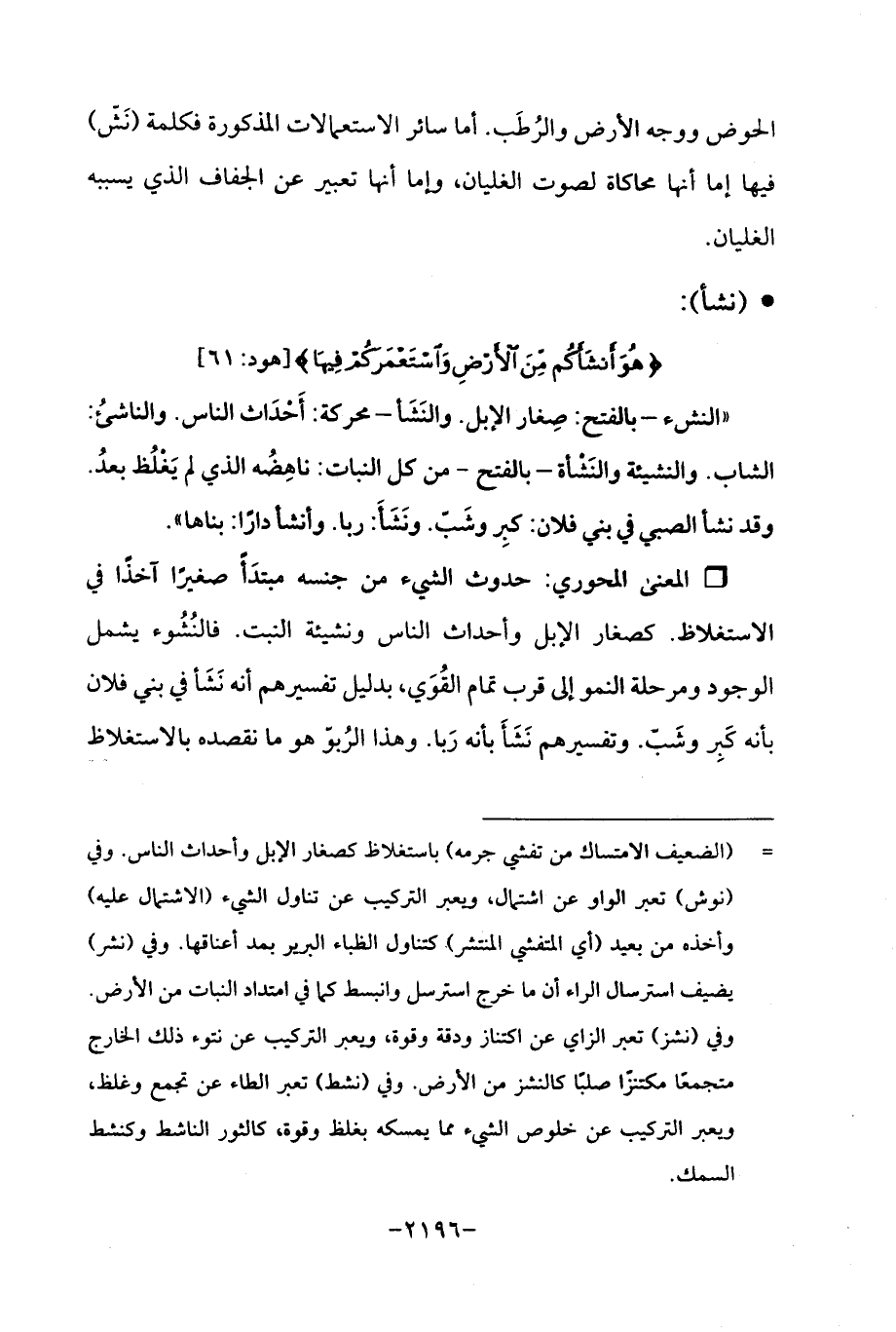 Qحدوث الشيء من جنسه مبتدَأ صغيرًا آخذًا في الاستغلاظ. كصغار الإبل وأحداث الناس ونشيئة النبت. فالنُشُوء يشمل الوجود ومرحلة النمو إلى قرب تمام القُوَي، بدليل تفسيرهم أنَّه نشأ في بني فلان بأنه كَبِر وشبَّ. وتفسيرهم نشأ بأنه رَبا. وهذا الرُبوّ هو ما نقصده بالاستغلاظ