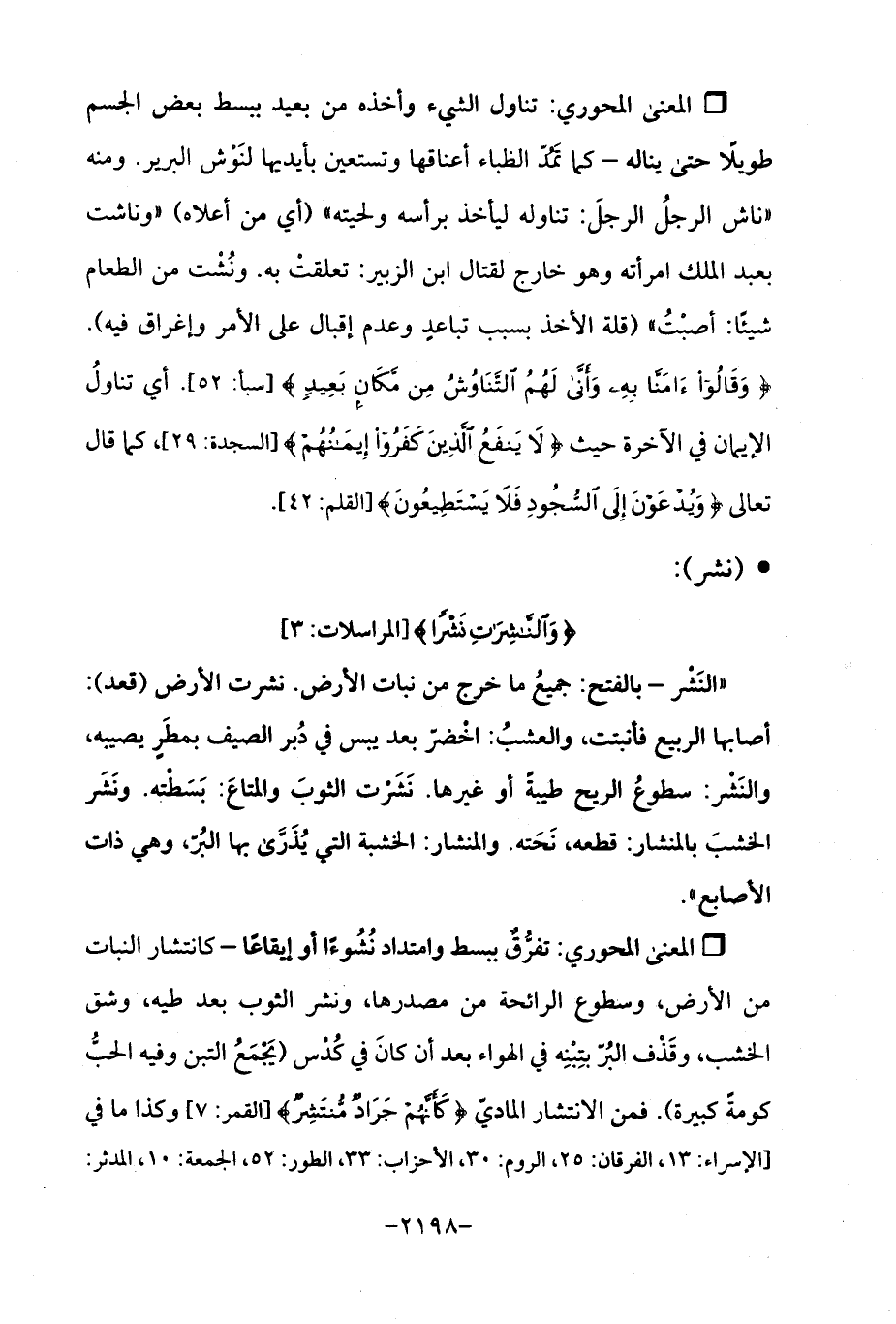 Qتفرُّقٌ ببسط وامتداد نُشُوءًا أو إيقاعًا - كانتشار النبات من الأرض، وسطوع الرائحة من مصدرها، ونشر الثوب بعد طيه، وشق الحشب، وقَذْف البُرّ بتبْنِه في الهواء بعد أن كانَ في كُدْس (يَجْمَعُ التبن وفيه الحبُّ كومةً كبيرة). فمن الانتشار الماديّ {كَأَنَّهُمْ جَرَادٌ مُنْتَشِرٌ} [القمر: 7]، وكذا ما في الإسراء: 13، الفرقان: 25، الروم: 30، الأحزاب: 33، الطور: 52، الجمعة: 10، المدثر: