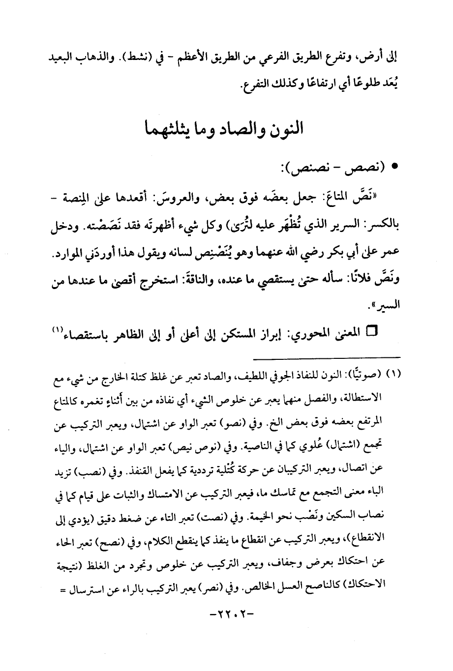 (¬1) (صوتيًّا): النون للنفاذ الجوفي اللطيف، والصاد تعبر عن غلظ كتلة الخارج من شيء مع الاستطالة، والفصل منهما يعبر عن خلوص اليء أي نفاذه من بين أثناءٍ تغمره كالمتاع المرتفع بعضه فوق بعض الخ. وفي (نصو) تعبر الواو عن اشتمال، ويعبر التركيب عن تجمع (اشتمال) عُلوي كما في الناصية. وفي (نوص نيص) تعبر الواو عن اشتمال، والياء عن اتصال، ويعبر التركيان عن حركة كُتلية ترددية كما يفعل القنفذ. وفي (نصب) تزيد الباء معنى التجمع مع تماسك ما، فيعبر التركيب عن الامتساك والثبات على قام كما في نصاب السكين ونَضْب نحو الخيمة. وفي (نصت) تعبر التاء عن ضغط دقيق (يؤدي إلى الانقطاع)، ويعبر التركيب عن انقطاع ما ينفذ كما ينقطع الكلام، وفي (نصح) تعبر الحاء عن احتكاك بمرض وجفاف، ويعبر التركيب عن خلوص وتجرد من الغلظ (نتيجة الاحتكاك) كالناصح العسل الخالص. وفي (نصر) يعبر التركيب بالراء عن استرسال =