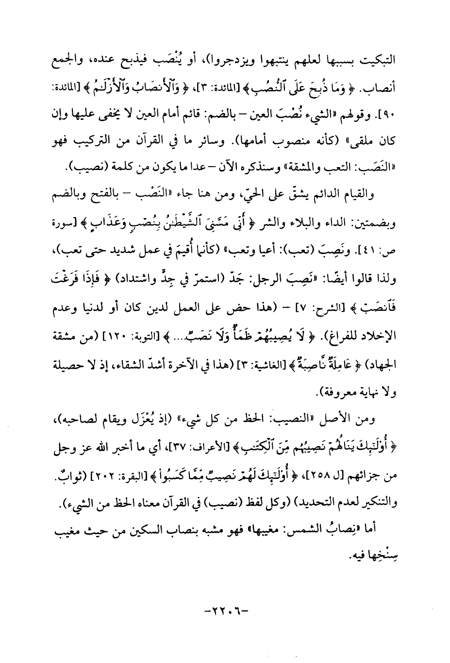 التبكيت بسبها لعلهم ينتبهوا ويزدجروا)، أو يُنْصَب فيذبح عنده، والجمع أنصاب. {وَمَا ذُبِحَ عَلى النُّصُبِ} [المائدة: 3]، {وَالْأَنْصَابُ وَالْأَزْلَامُ} [المائدة: 90]. وقولهم "الشيء نُصبَ العين - بالضم: قائم أمام العين لا يخفى عليها وإن كان ملقى " (كأنه منصوب أمامها). وسائر ما في القرآن من التركيب فهو "النَصَب: التعب والمشقة "وسنذكره الآن - عدا ما يكون من كلمة (نصيب).