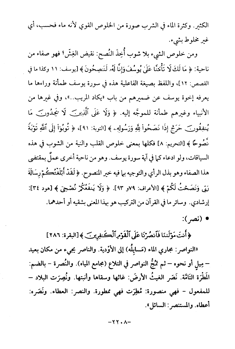 ومن خلوص الشيء بلا شوب أُخِذَ النُصح: نقيض الغِشّ؛ فهو صفاء من ناحية: {مَا لَكَ لَا تَأْمَنَّا عَلَى يُوسُفَ وَإِنَّا لَهُ لَنَاصِحُونَ} [يوسف: 11] وكذا ما في القصص: 12]، واللفظ بصيغة الفاعية هذه في سورة يوسف طمأنة وراءها ما يعرفه إخوة يوسف عن ضميرهم عن باب "يكاد المريب .. "، وفي غيرها من الأنبياء وغيرهم طمأنة للموجَّه إليه. {وَلَا عَلَى الَّذِينَ لَا يَجِدُونَ مَا يُنْفِقُونَ حَرَجٌ إِذَا نَصَحُوا لِلَّهِ وَرَسُولِهِ} [التوبة: 91] {تُوبُوا إِلَى اللَّهِ تَوْبَةً نَصُوحًا} [التحريم: 8] فكلها بمعنى خلوص القلب والنية من الشوب في هذه السياقات، ولو ادعاء كما في آية سورة يوسف. وهو من ناحية أخرى عمل بمقتضى هذا الصفاء وهو بذل الرأي والتوجيه بما فيه خير المنصوح. {لَقَدْ أَبْلَغْتُكُمْ رِسَالةَ رَبِّي وَنَصَحْتُ لَكُمْ} [الأعراف: 79 و 93] {وَلَا يَنْفَعُكُمْ نُصْحِي} [هود: 34] إرشادي. وسائر ما في القرآن من التركيب هو بهذا المعنى بشقيه أو أحدهما.
