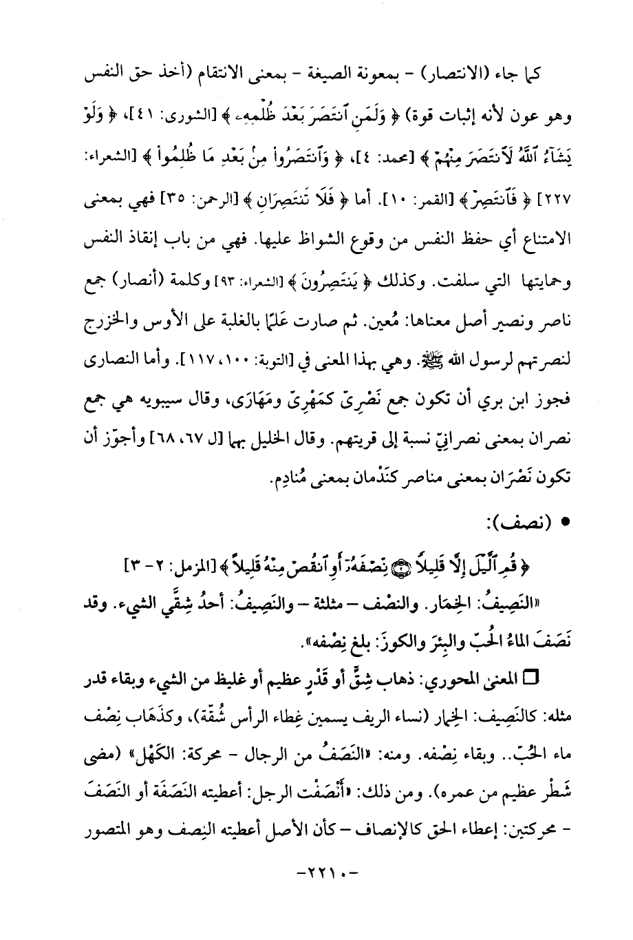 كما جاء (الانتصار) - بمعونة الصيغة - بمعنى الانتقام (أخذ حق النفس وهو عون لأنه إثبات قوة) {وَلَمَنِ انْتَصَرَ بَعْدَ ظُلْمِهِ} [الشورى: 41]، {وَلَوْ يَشَاءُ اللَّهُ لَانْتَصَرَ مِنْهُمْ} [محمد: 4]، {وَانْتَصَرُوا مِنْ بَعْدِ مَا ظُلِمُوا} [الشعراء: 227] {فَانْتَصِرْ} [القمر: 10] {فَلَا تَنْتَصِرَانِ} [الرحمن: 35] فهي بمعنى الامتناع أي حفظ النفس من وقوع الشواظ عليها. فهي من باب إنقاذ النفس وحمايتها التي سلفت. وكذلك {يَنْتَصِرُونَ} [الشعراء: 93]، وكلمة (أنصار) جمع ناصر ونصير أصل معناها: مُعين. ثم صارت عَلمًا بالغلبة على الأوس والخزرج لنصرتهم لرسول الله - صلى الله عليه وسلم -. وهي بهذا المعنى في [التوبة: 100، 117]. وأما النصارى فجوز ابن بري أن تكون جمع نَصْرِى كمَهْرِيّ ومَهَارَى، وقال سيبويه هي جمع تكون بمعنى نصرانِيّ نسبة إلى قريتهم. وقال الخليل بهما [ل 67، 68] وأجوّز أن تكون نَصْرَان بمعنى مناصر كنَدْمان بمعنى مُنادِم.