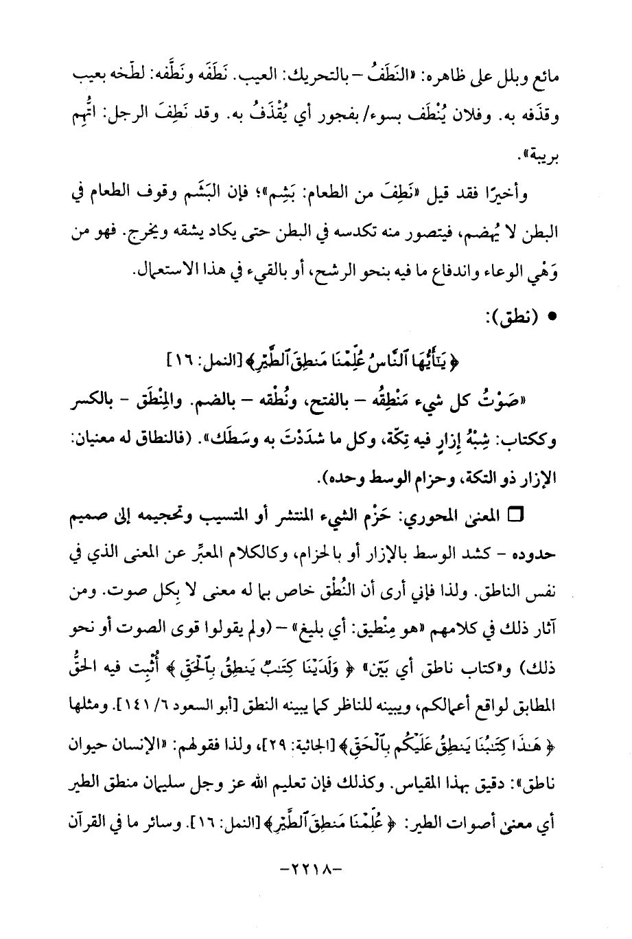 Qحَرم الشيء المنتشر أو المتسيب وتحجيمه إلى صميم حدوده- كشد الوسط بالإزار أو بالحزام، وكالكلام المعبِّر عن المعنى الذي في نفس الناطق. ولذا فإني أرى أن النُطْق خاص بما له معنى لا بِكل صوت. ومن آثار ذلك في كلامهم "هو مِنْطيق: أي بليغ "- (ولم يقولوا قوى الصوت أو نحو ذلك) و "كتاب ناطق أي بَيّن " {وَلَدَينَا كِتَابٌ يَنْطِقُ بِالْحَقِّ} أُثبِت فيه الحق المطابق لواقع أعمالكم، ويبينه للناظر كما يبينه النطق [أبوالله عود 6/ 141]. ومثلها {هَذَا كِتَابُنَا يَنْطِقُ عَلَيكُمْ بِالْحَقِّ} [الجاثية: 29]، ولذا فقولهم: "الإنسان حيوان ناطق ": دقيق بهذا المقياس. وكذلك فإن تعليم الله عزَّ وجلَّ سليمان منطق الطير أي معنى أصوات الطير: {عُلِّمْنَا مَنْطِقَ الطَّيرِ} [النمل: 16]. وسائر ما في القرآن