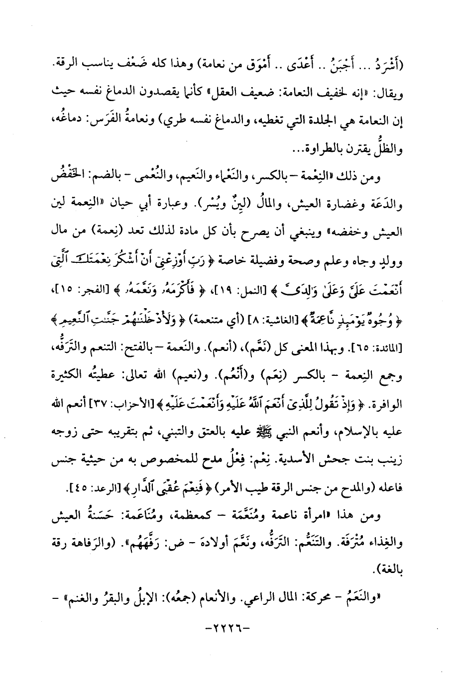 (أَشْرَدُ ... أَجْبَنُ .. أَعْدَى .. أمْوَق من نعامة) وهذا كله ضَعْف يناسب الرقة. ويقال: "إنه لخفيف النعامة: ضعيف العقل "كأنما يقصدون الدماغ نفسه حيث إن النعامة هي الجلدة التي تغطيه، والدماغ نفسه طري) ونعامةُ الفَرَس: دماغُه، والظلُّ يقترن بالطراوة ... ومن ذلك "النِعْمة -بالكسر، والنَعْماء والنَعيم، والنُعْمى- بالضم: الخَفْضُ والدَعَة وغضارة العيش، والمالُ (ليِنٌ ويُسْر). وعبارة أبي حيان "النِعمة لين العيش وخفضه "ويشغي أن يصرح بأن كل مادة لذلك تعد (نِعمة) من مال وولدٍ وجاه وعلم وصحة وفضيلة خاصة {رَبِّ أَوْزِعْنِي أَنْ أَشْكُرَ نِعْمَتَكَ الَّتِي أَنْعَمْتَ عَلَيَّ وَعَلَى وَالِدَيَّ} [النمل: 19]، {فَأَكْرَمَهُ وَنَعَّمَهُ} [الفجر: 15]، {وُجُوهٌ يَوْمَئِذٍ نَاعِمَةٌ} [الغاشية: 8] (أي متنعمة) ({وَلَأَدْخَلْنَاهُمْ جَنَّاتِ النَّعِيمِ} [المائدة: 65]. وبهذا المعنى كل (نَعَّم)، (أنعم). والنَعمة -بالفتح: التنعم والتَّرفُّه، وجمع النِعمة -بالكسر (نِعَم) و (أَنْعُم). و (نعيم) الله تعالى: عطيتُه الكثيرة الوافرة. {وَإِذْ تَقُولُ لِلَّذِي أَنْعَمَ اللَّهُ عَلَيهِ وَأَنْعَمْتَ عَلَيهِ} [الأحزاب: 37] أنعم الله عليه بالإسلام، وأنعم النبي - صلى الله عليه وسلم - عليه بالعتق والتبني، ثم بتقريبه حتى زوجه زينب بنت جحش الأسدية. نِعْم: فِعْلُ مدح للمخصوص به من حيثية جنس فاعله (والمدح من جنس الرقة طيب الأمر) {فَنِعْمَ عُقْبَى الدَّارِ} [الرعد: 24].
