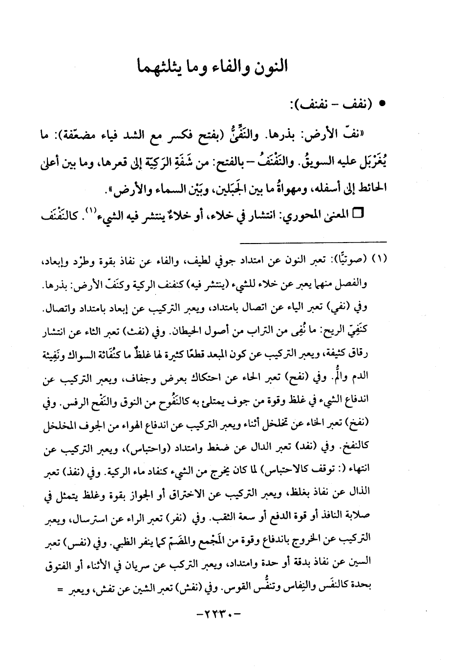 (¬1) (صوتيًّا): تعبر النون عن امتداد جوفي لطيف، والفاء عن نفاذ بقوة وطرْد وإبعاد، والفصل منهما يعبر عن خلاء للشيء (ينتشر فيه) كنفنف الركية وكنَفّ الأرض: بذرها. وفي (نفي) تعبر الياء عن اتصال بامتداد، ويعبر التركيب عن إبعاد بامتداد واتصال. كنَفِيّ الريح: ما نُفِي من التراب من أصول الحيطان. وفي (نفث) تعبر الثاء عن انتشار رقاق كثيفة، ويعبر التركيب عن كون المبعد قطعًا كثيرة لها غلظٌ ما كنُفَاثة السواك ونَفِيثة الدم والُّم. وفي (نفح) تعبر الحاء عن احتكاك بعرض وجفاف، ويعبر التركيب عن اندفاع الشيء في غلظ وقوة من جوف يمتلئ به كالنَفُوح من النوق والنَفْح الرفس. وفي (نفخ) تعبر الخاء عن تخلخل أثناء ويعبر التركيب عن اندفاع الهواء من الجوف المخلخل كالنفخ. وفي (نفد) تعبر الدال عن ضغط وامتداد (واحتباس)، ويعبر التركيب عن انتهاء (: توقف كالاحتباس) لما كان يخرج من الشيء كنفاد ماء الركية. وفي (نفذ) تعبر الذال عن نفاذ بغلظ، ويعبر التركيب عن الاختراق أو الجواز بقوة وغلظ يتمثل في صلابة النافذ أو قوة الدفع أو سعة الثقب. وفي (نفر) تعبر الراء عن استرسال, ويعبر التركيب عن الخروج باندفاع وقوة من المَجْمع والمضَمّ كما ينفر الظبي. وفي (نفس) تعبر السين عن نفاذ بدنة أو حدة وامتداد، ويعبر التركب عن سريان في الأثناء أو الفتوق بحدة كالنفس والنِفاس وتنفُس القوس. وفي (نفق) تعبر الشين عن تفش، ويعبر =