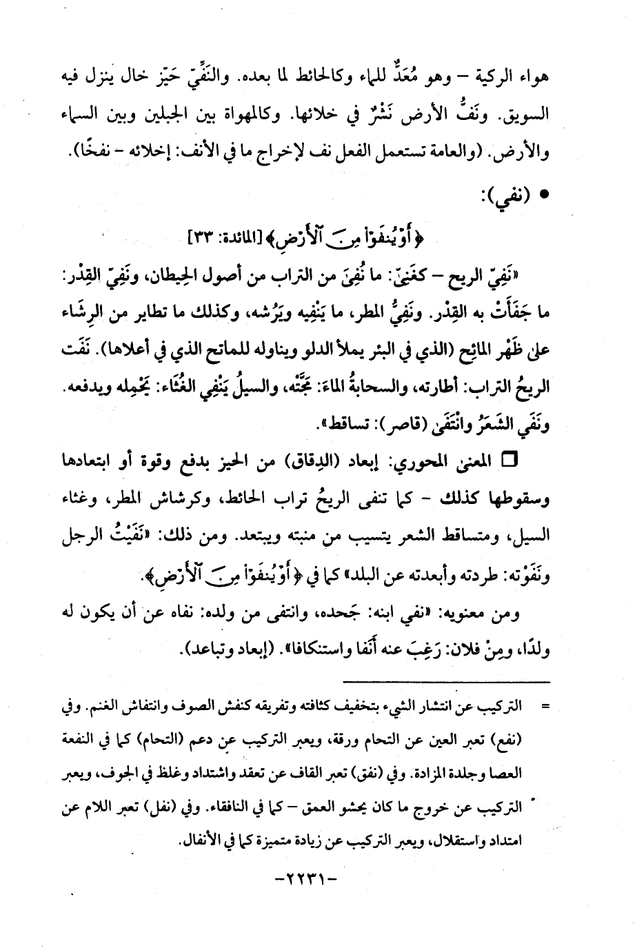 "نَفِي الريح - كغَنِيّ: ما نُفِيَ من التراب من أصول الحِيطان، ونَفِيّ القِدْر: ما جَفَأَتْ به القِدْر. ونَفِيُّ المطر، ما يَنْفِيه وَيرُشه، وكذلك ما تطاير من الرِضَاء على ظَهْر المائِح (الذي في البئر يملأ الدلو ويناوله للماتح الذي في أعلاها). نَفَت الريحُ التراب: أطارته، والسحابةُ الماءَ: مَجَّتْه، والسيلُ يَنْفِي الغُثاء: يَحْمِله ويدفعه. ونَفَي الشَعَرُ وانتَفَى (قاصر): تساقط ".