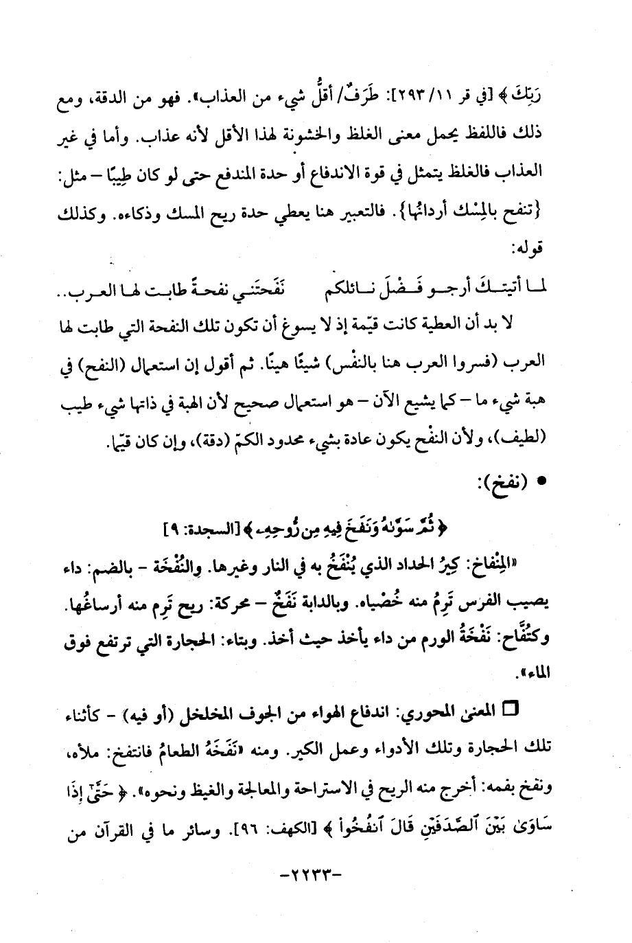 Qاندفاع افواء من الجوف المخلخل (أو فيه) -كأثناء تلك الحجارة وتلك الأدواء وعمل الكير. ومنه "نَفَخَهُ الطعامُ فانتفخ: ملأه، ونفخ بفمه: أخرج منه الريح في الاستراحة والمعالجة والغيظ ونحوه ". {حَتَّى إِذَا سَاوَى بَينَ الصَّدَفَينِ قَال انْفُخُوا} [الكهف: 96]. وسائر ما في القرآن من