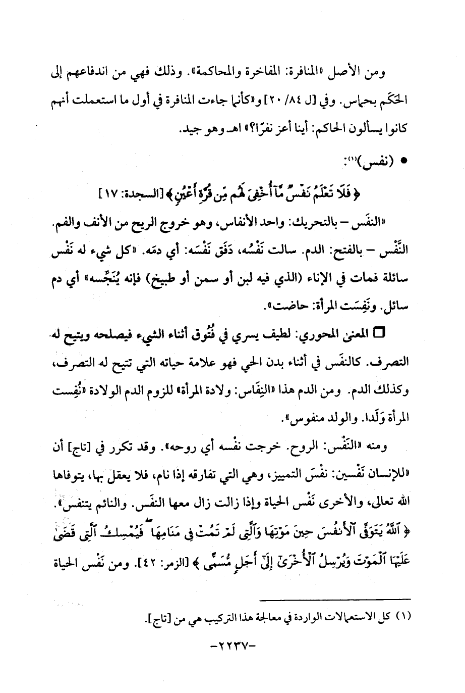 ومنه "النَفْس: الروح. خرجت نفسه أي روحه ". وقد تكرر في [تاج] أن "للإنسان نَفْسين: نفْسَ التمييز، وهي التي تفارقه إذا نام، فلا يعقل بها، يتوفاها الله تعالى، والأخرى نَفْس الحياة وإذا زالت زال معها النفَس. والنائم يتنفس ". {اللَّهُ يَتَوَفَّى الْأَنْفُسَ حِينَ مَوْتِهَا وَالَّتِي لَمْ تَمُتْ فِي مَنَامِهَا فَيُمْسِكُ الَّتِي قَضَى عَلَيهَا الْمَوْتَ وَيُرْسِلُ الْأُخْرَى إِلَى أَجَلٍ مُسَمًّى} [الزمر: 42]. ومن نَفْس الحياة