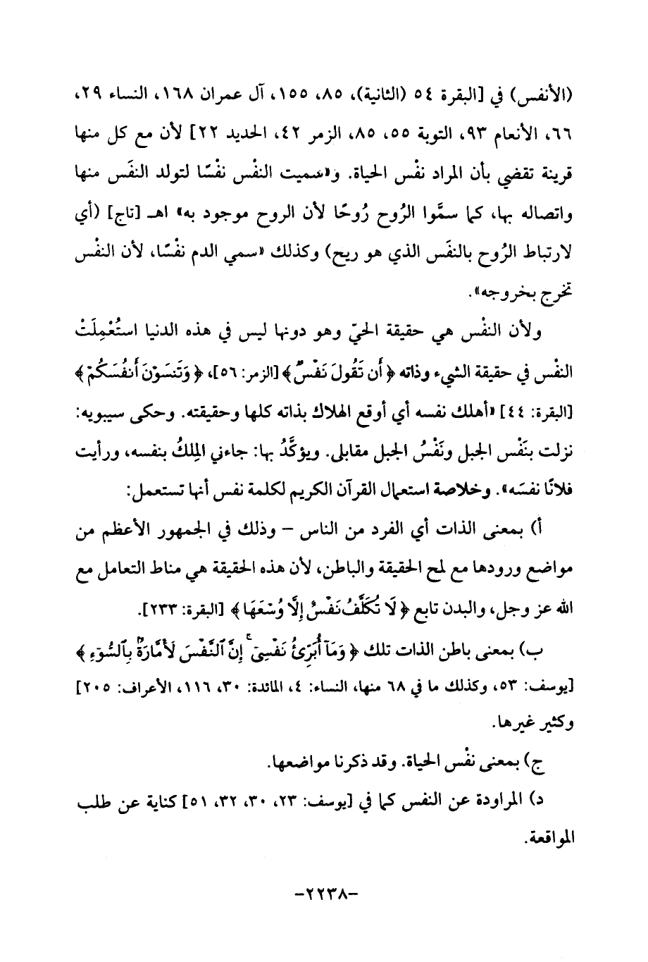 ب) بمعنى باطن الذات تلك {وَمَا أُبَرِّئُ نَفْسِي إِنَّ النَّفْسَ لَأَمَّارَةٌ بِالسُّوءِ} [يوسف: 53، وكذلك ما في 68 منها، النساء: 4، المائدة 30، 116، الأعراف: 205] وكثير غيرها.