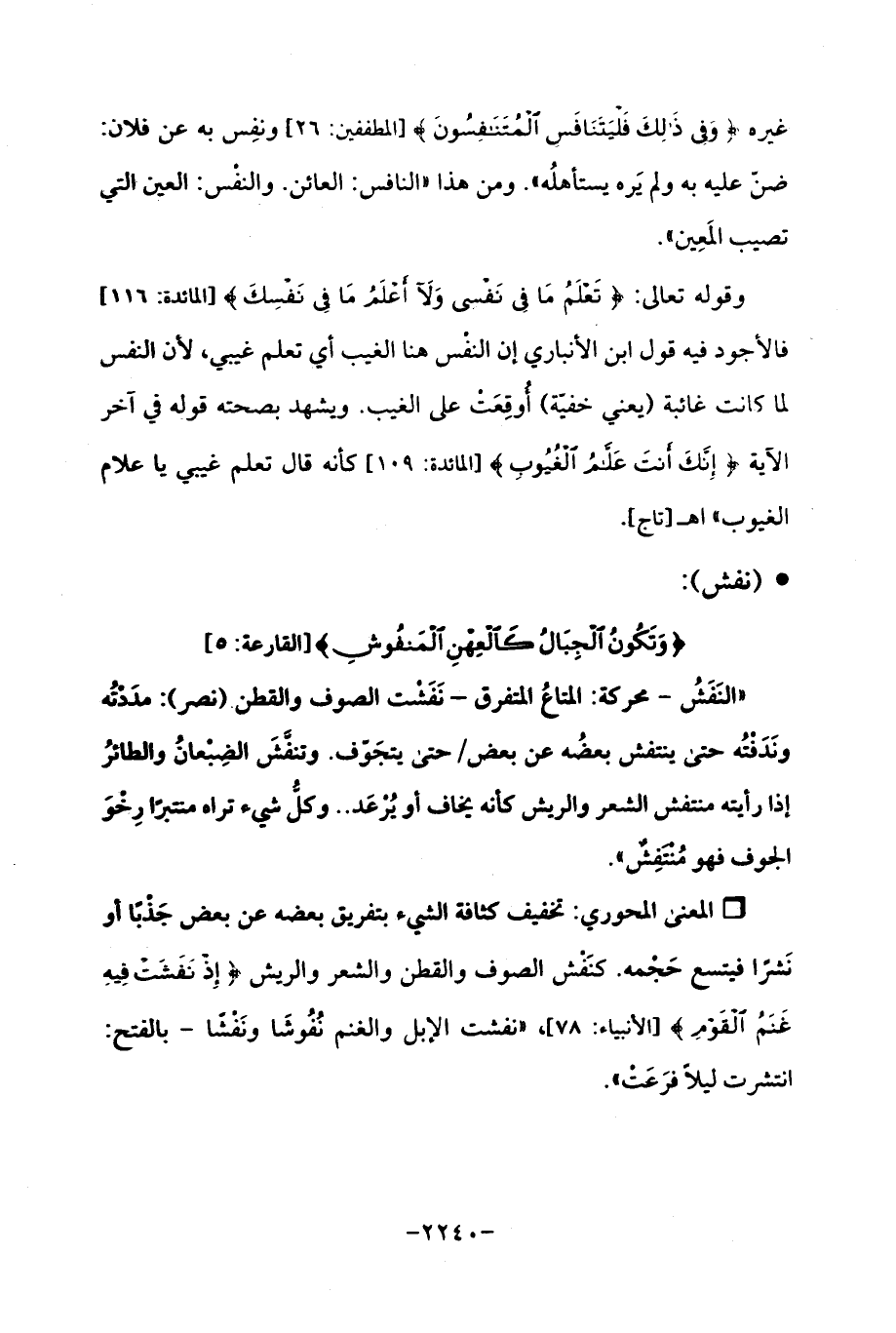 Qتخفيف كثافة الشيء بتفريق بعضه عن بعض جَذْبًا أو نَشرًا فيتسع حَجْمه. كنَفْش الصوف والقطن والشعر والريش {إِذْ نَفَشَتْ فِيهِ غَنَمُ الْقَوْمِ} [الأنبياء: 78] , "نفشت الإبل والغنم نُفُوشًا ونَفْشًا -بالفتح: انشرت ليلًا فرَعَتْ ".