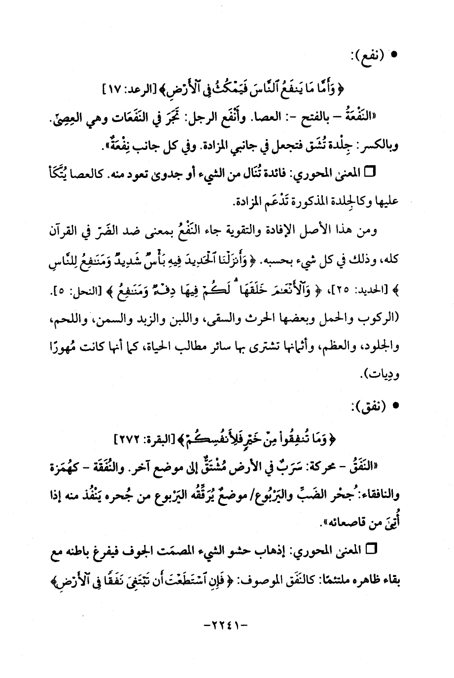 ومن هذا الأصل الإفادة والتقوية جاء النَفْعُ بمعنى ضد الضَرّ في القرآن كله، وذلك في كل شيء بحسبه. {وَأَنْزَلْنَا الْحَدِيدَ فِيهِ بَأْسٌ شَدِيدٌ وَمَنَافِعُ لِلنَّاسِ} [الحديد: 25]، {وَالْأَنْعَامَ خَلَقَهَا لَكُمْ فِيهَا دِفْءٌ وَمَنَافِعُ} [النحل: 5]. (الركوب والحمل وبعضها الحرث والسقى، واللبن والزبد والسمن، واللحم، والجلود، والعظم، وأثمانها تشترى بها سائر مطالب الحياة، كما أنَّها كانت مُهورًا ودِيات).