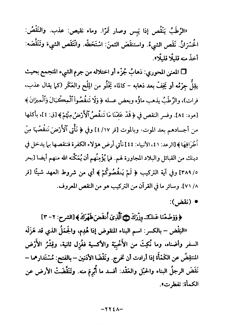 Qذهابُ جُزء أو اختلاله من جرم الشيء المتجمع بحيث يقِلُّ جِرْمُه أو يَخِفّ بعد ذهابه- كالماء يَخْلُو من المِلْح والعَكَر (كما يقال عذب، فرات)، والرُطَبُ يذهب ماؤُه وبعض عسله {وَلَا تَنْقُصُوا الْمِكْيَال وَالْمِيزَانَ} [هود: 84]. وفسر النقص في {قَدْ عَلِمْنَا مَا تَنْقُصُ الْأَرْضُ مِنْهُمْ} [ق: 4]، بأكلها من أجسادهم بعد الموت، وبالموت [قر 17/ 4] وفي {نَأْتِي الْأَرْضَ نَنْقُصُهَا مِنْ أَطْرَافِهَا} [الرعد: 41، الأنبياء: 44] نأتي أرض هؤلاء الكفرة فننقصها بما يدخل في دينك من القبائل والبلاد المجاورة لهم. فما يُؤْمِنُهم أن يُمَكِّنه الله منهم أيضًا [بحر 5/ 389] وفي آية التركيب {لَمْ يَنْقُصُوكُمْ} أي من شروط العهد شيئًا [قر 8/ 71]. وسائر ما في القرآن من التركيب هو من النقص المعروف.