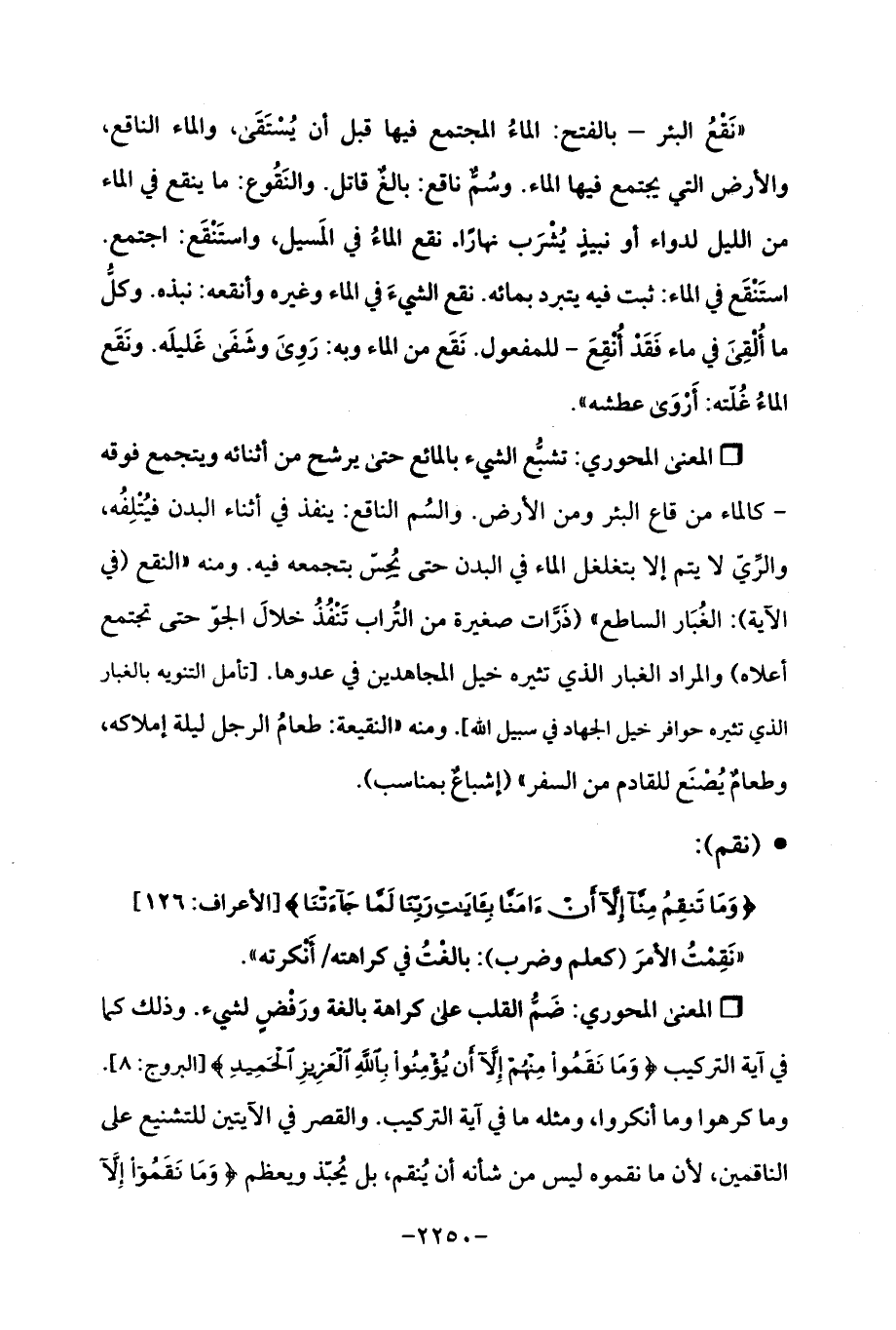 Qتشبُّع الشيء بالمائع حتى يرشح من أثنائه ويتجمع فوقه - كالماء من قاع البئر ومن الأرض. والسُم الناقع: ينفذ في أثناء البدن فيُتلِفُه، والرِّيّ لا يتم إلَّا بتغلغل الماء في البدن حتَّى يُحِسّ بتجمعه فيه. ومنه "النقع (في الآية): الغُبَار الساطع " (ذَرَّات صغيرة من التُّراب تَنْفُذُ خلال الجوّ حتَّى تجتمع أعلاه) والمراد الغبار الذي تثيره خيل المجاهدين في عدوها. [تأمل التنويه بالغبار الذي تثيره حوافر خيل الجهاد في سبيل الله]. ومنه "النقيعة: طعامُ الرجل ليلة إملاكه، وطعامٌ يُصْنع للقادم من السَّفر " (إشباعٌ بمناسب).