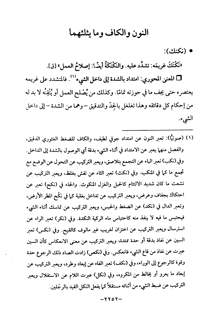 (¬1) (صوتيًّا): تعبر النون عن امتداد جوفي لطيف، والكاف للضغط الغئوري الدقيق، والفصل منهما يعبر عن الامتداد في أثناء الشيء بدقة أي الوصول بالشدة إلى الداخل. وفي (نكب) تعبر الباء عن التجمع بتلاصق، ويعبر التركيب عن التحول عن الوضع مع تجمع ما كما في المنكب. وفي (نكث) تعبر الثاء عن تفش بغلظ، ويعبر التركيب عن تشعث ما كان شديد الالتئام كالحبل والغزل المنكوث. والحاء في (نكح) تعبر عن احتكاك بجفاف وعرض، ويعبر التركيب عن تداخل بغلبة كما في نكْح المطر الأرض، وتعبر الدال في (نكد) عن الضغط والحبس، ويعبر التركيب عن تماسك أثناء الشيء فيحتبس ما فيه لا ينفذ منه كاحتباس ماء الركية النكدة وفي (نكر) تعبر الراء عن استرسال ويعبر التركيب عن اختزان لغريب غير مألوف كالقيح. وفي (نكس) تعبر السين عن نفاذ بدقة أو حدة ممتدة، ويعبر الترغيب عن معنى الانعكاس كأن السين عبرت عن نفاذ من قاع الشيء فانعكس. وفي (نقص) زادت الصاد ذلك الرجوع حدة وقوة كالرجوع إلى الوراء، وفي (نكف) تعبر الفاء عن إبعاد وطرد، ويعبر التركيب عن إبعاد ما يعرو أو يخالط من المكروه، وفي (نكل) عبرت اللام عن الاستقلال ويعبر التركيب عن ضبط الشيء من أثنائه مستقلًا كما يفعل النكل القيد بالرجلين.