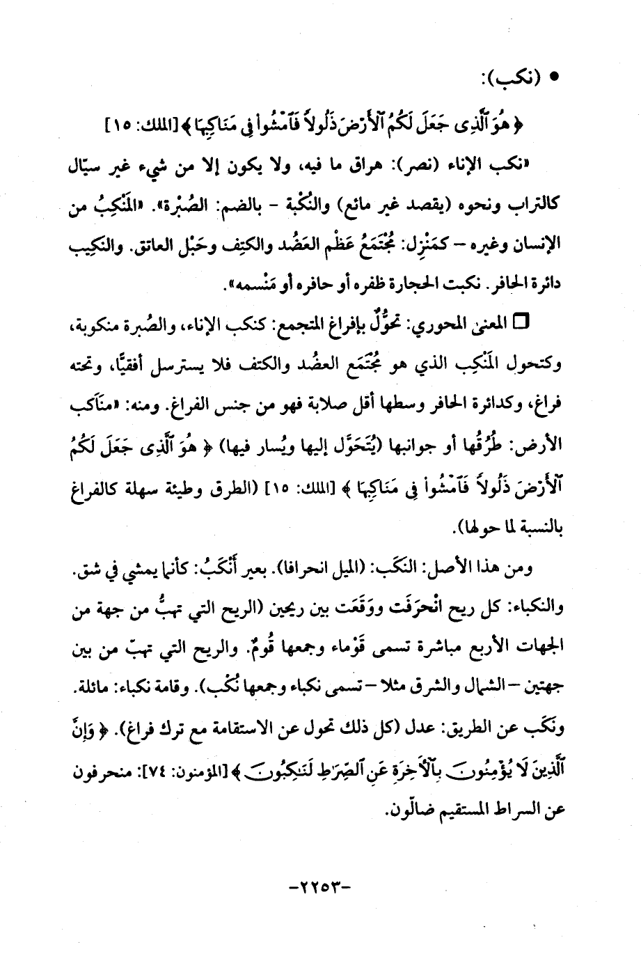 Qتحوُّلٌ بإفراغ المتجمع: كنكب الإناء، والصُبرة منكوبة، وكتحول المَنْكِب الذي هو مُجتمَع العضُد والكتف فلا يسترسل أفقيًّا، وتحته فراغ، وكدائرة الحافر وسطها أقل صلابة فهو من جنس الفراغ. ومنه: "منَاكب الأرض: طُرُقُها أو جوانبها (يُتَحَوَّل إليها ويُسار فيها) {هُوَ الَّذِي جَعَلَ لَكُمُ الْأَرْضَ ذَلُولًا فَامْشُوا فِي مَنَاكِبِهَا} [الملك: 15] (الطرق وطيئة سهلة كالفراغ بالنسبة لما حولها).