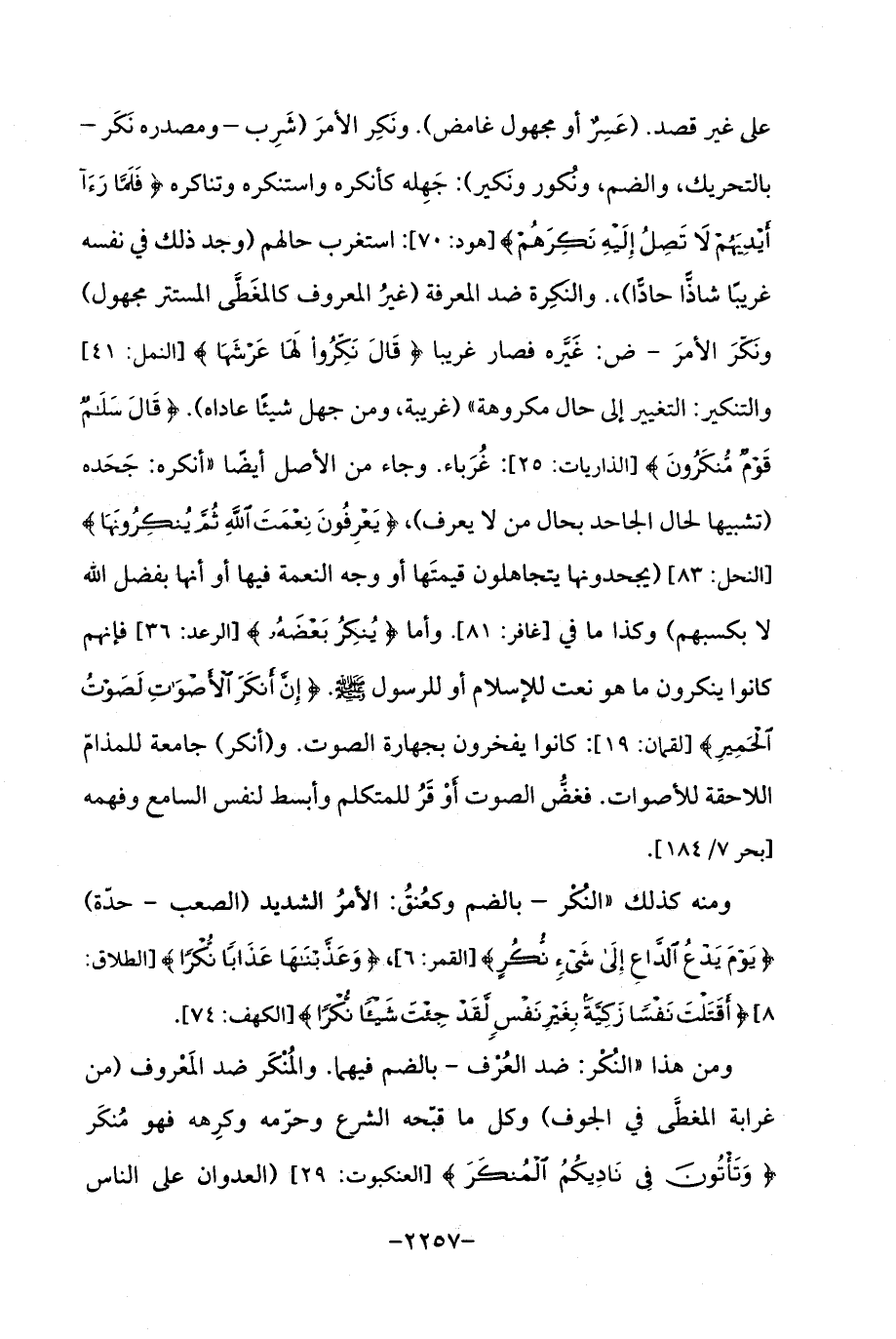 على غير قصد. (عَسِرٌ أو مجهول غامض). ونكر الأمرَ (شَرِب -ومصدره نكر- بالتحريك، والضم، ونُكور ونكير): جَهِله كأنكره واستنكره وتناكره {فَلَمَّا رَأَى أَيدِيَهُمْ لَا تَصِلُ إِلَيهِ نَكِرَهُمْ} [هود: 70]: استغرب حالهم (وجد ذلك في نفسه غريبًا شاذًّا حادًّا)، والنكِرة ضد المعرفة (غيرُ المعروف كالمغَطَّى المستتر مجهول) ونكرَ الأمرَ- ض: غيَّره فصار غريبا {قَال نَكِّرُوا لَهَا عَرْشَهَا} [النمل: 41] والتنكير: التغيير إلى حال مكروهة " (غريبة، ومن جهل شيئًا عاداه). {قَال سَلَامٌ قَوْمٌ مُنْكَرُونَ (25)} [الذاريات: 25]: غُرَباء. وجاء من الأصل أيضًا "أنكره: جَحَده (تشبيها لحال الجاحد بحال من لا يعرف)، {يَعْرِفُونَ نِعْمَتَ اللَّهِ ثُمَّ يُنْكِرُونَهَا} [النحل: 83] (يجحدونها يتجاهلون قيمتَها أو وجه النعمة فيها أو أنها بفضل الله لا بكسبهم) وكذا ما في [غافر: 81]. وأما {يُنْكِرُ بَعْضَهُ} [الرعد: 36] فإنهم كانوا ينكرون ما هو نعت للإسلام أو للرسول - صلى الله عليه وسلم -. {إِنَّ أَنْكَرَ الْأَصْوَاتِ لَصَوْتُ الْحَمِيرِ (19)} [لقمان: 19]: كانوا يفخرون بجهارة الصوت. و (أنكر) جامعة للمذامّ اللاحقة للأصوات. فغضُّ الصوت أو قَرُ للمتكلم وأبسط لنفس السامع وفهمه [بحر 7/ 184].