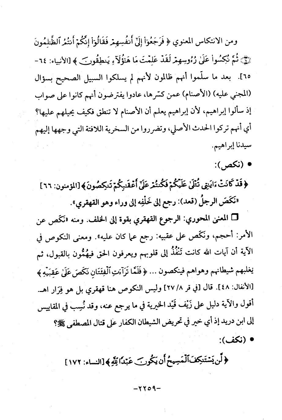 Qالرجوع القهقري بقوة إلى الخلف. ومنه "نكص عن الأمر: أحجم، ونكص على عقبيه: رجع عما كان عليه ". ومعنى النكوص في الآية أن آيات الله كانت تَنْفُذُ إلى قلوبهم ويعرفون الحق فيهُمُّون بالقبول، ثم يغلبهم شيطانهم وهواهم فينكصون ... {فَلَمَّا تَرَاءَتِ الْفِئَتَانِ نَكَصَ عَلَى عَقِبَيهِ} [الأنفال: 48]. قال [في قر 8/ 27] وليس النكوص هنا قهقري بل هو فِرَار اهـ. أقول والآية دليل على زَيْف قَيْد الخيرية في ما يرجع عنه، وقد نُسِب في المقاييس إلى ابن دريد إذ أي خير في تحريض الشيطان الكفار على قتال المصطفى - صلى الله عليه وسلم -؟