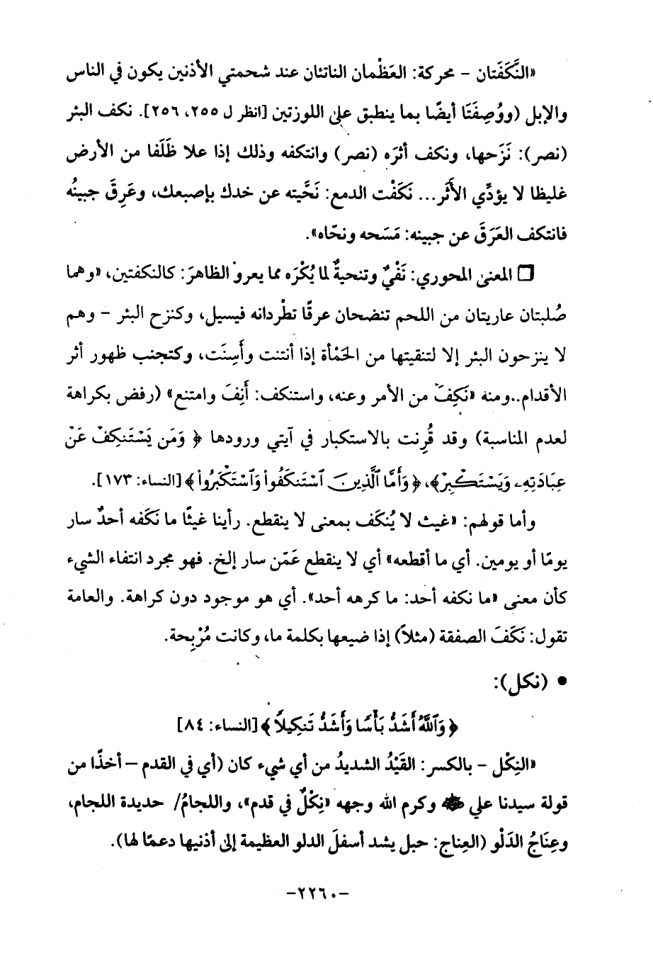 "النَكَفَتان- محركة: العَظْمان الناتئان عند شحمتي الأذنين يكون في الناس والإبل (ووُصفَتَا أيضًا بما ينطبق على اللوزتين [انظر ل 255، 256]. نكف البئر (نصر): نَزَحها، ونكف أثرَه (نصر) وانتكفه وذلك إذا علا ظَلَفا من الأرض غليظا لا يؤدِّي الأثر ... نكفت الدمع: نَحَّيته عن خدك بإصبعك، وعَرِقَ جبينُه فانتكف العَرَقَ عن جبينه: مَسَحه ونحاه ".