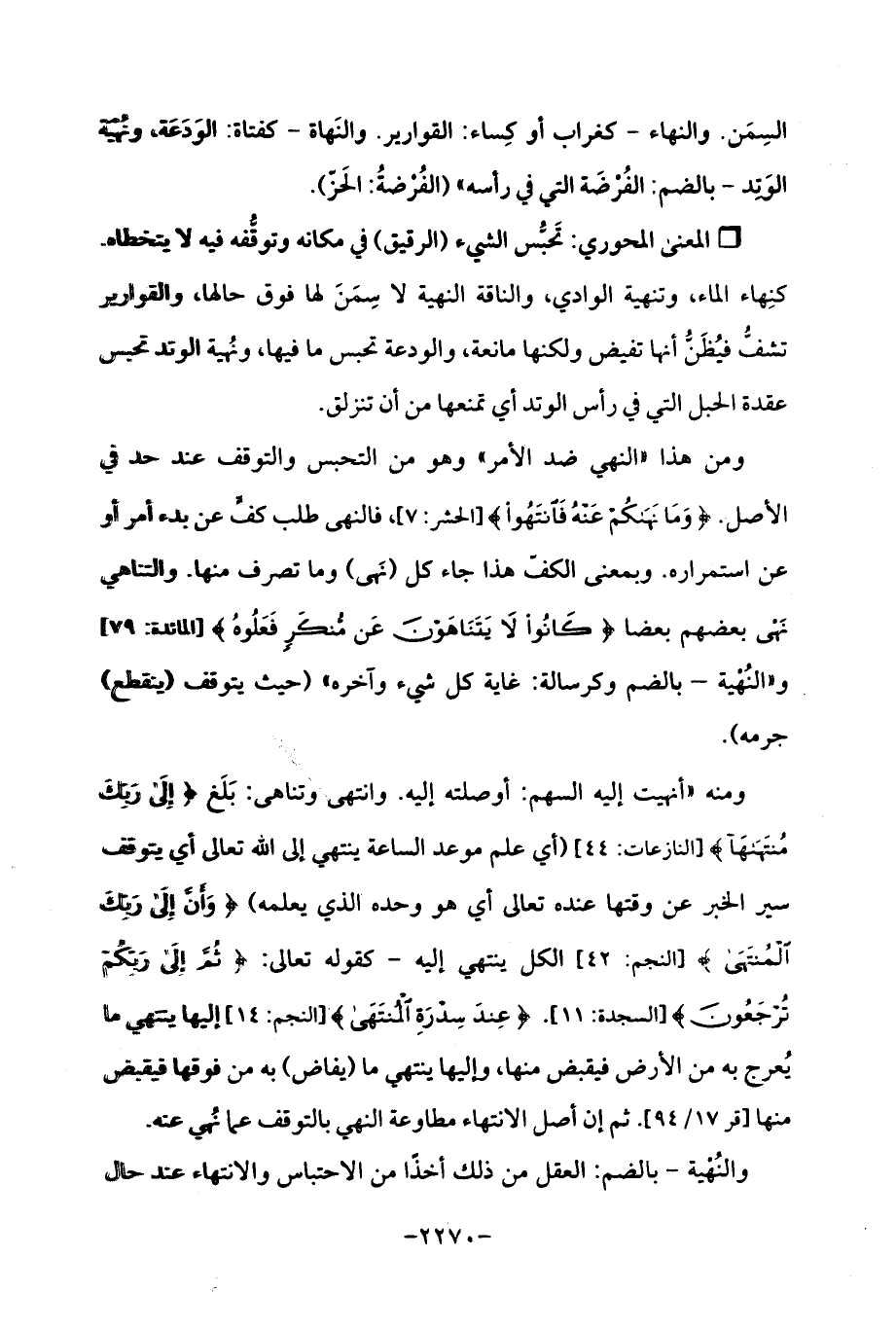 ومنه "أنهيت إليه السهم: أوصلته إليه. وانتهى وتناهى: بَلَغ {إِلَى رَبِّكَ مُنْتَهَاهَا (44)} [النازعات: 44] (أي علم موعد الساعة ينتهي إلى الله تعالى أي يتوقف سهب الخبر عن وقتها عنده تعالى أي هو وحده الذي يعلمه) ({وَأَنَّ إِلَى رَبِّكَ الْمُنْتَهَى (42)} [النجم: 42] الكل ينتهي إليه- كقوله تعالى: {ثُمَّ إِلَى رَبِّكُمْ تُرْجَعُونَ (11)} [السجدة: 11]. {عِنْدَ سِدْرَةِ الْمُنْتَهَى (14)} [النجم: 14] إليها ينتهي ما يُعرج به من الأرض فيقبض منها، وإليها ينتهي ما (يفاض) به من فوقها فيقبض منها [قر 17/ 94]. ثم إن أصل الانتهاء مطاوعة النهي بالتوقف عما نهى عنه.