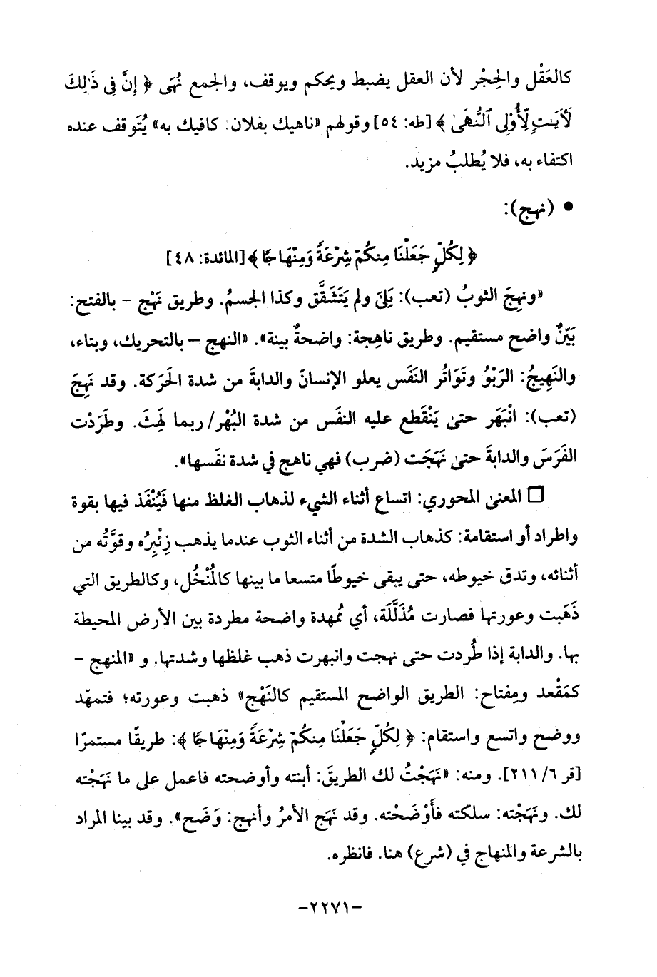 Qاتساع أثناء الشيء لذهاب الغلظ منها فَيُنْفَذ فيها بقوة واطراد أو استقامة: كذهاب الشدة من أثناء الثوب عندما يذهب زِئْبِرُه وقوَّتُه من أثنائه، وتدق يخوطه، حتى يبقى خيوطًا متسعا ما بينها كالمُنْخُل، وكالطريق التي ذَهَبت وعورتها فصارت مُذَلَّلَة، أي مُمهدة واضحة مطردة بين الأرض المحيطة بها. والدابة إذا طُردت حتى نهجت وانبهرت ذهب غلظها وشدتها. و "المنهج- كمَقْعد ومِفتاح: الطريق الواضح المستقيم كالنَهْج "ذهبت وعورته؛ فتمهّد ووضح واتسع واستقام: {لِكُلٍّ جَعَلْنَا مِنْكُمْ شِرْعَةً وَمِنْهَاجًا}: طريقًا مستمرًا [قر 6/ 211]. ومنه: "نَهَجْتُ لك الطريقَ: أبنته وأوضحته فاعمل على ما نَهَجْته لك. ونَهَجْته: سلكته فأَوْضَحْته. وقد نهج الأمرُ وأنهج: وَضَح ". وقد بينا المراد بالشرعة والمنهاج في (شرع) هنا. فانظره.