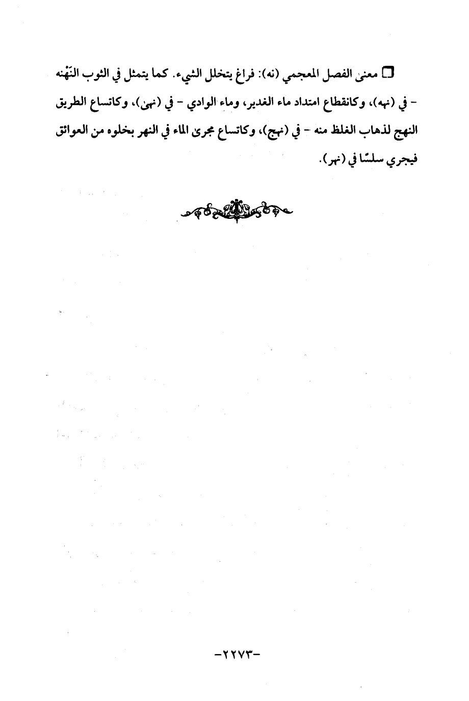 ° معنى الفصل المعجمي (نه): فراغ يتخلل الشيء. كما يتمثل في الثوب النَهْنه - في (نهه)، وكانقطاع امتداد ماء الغدير، وماء الوادي- في (نهى)، وكاتساع الطريق النهج لذهاب الغلظ منه- في (نهج)، وكاتساع مجرى الماء في النهر بخلوه من العوائق فيجري سلسًا في (نهر).
