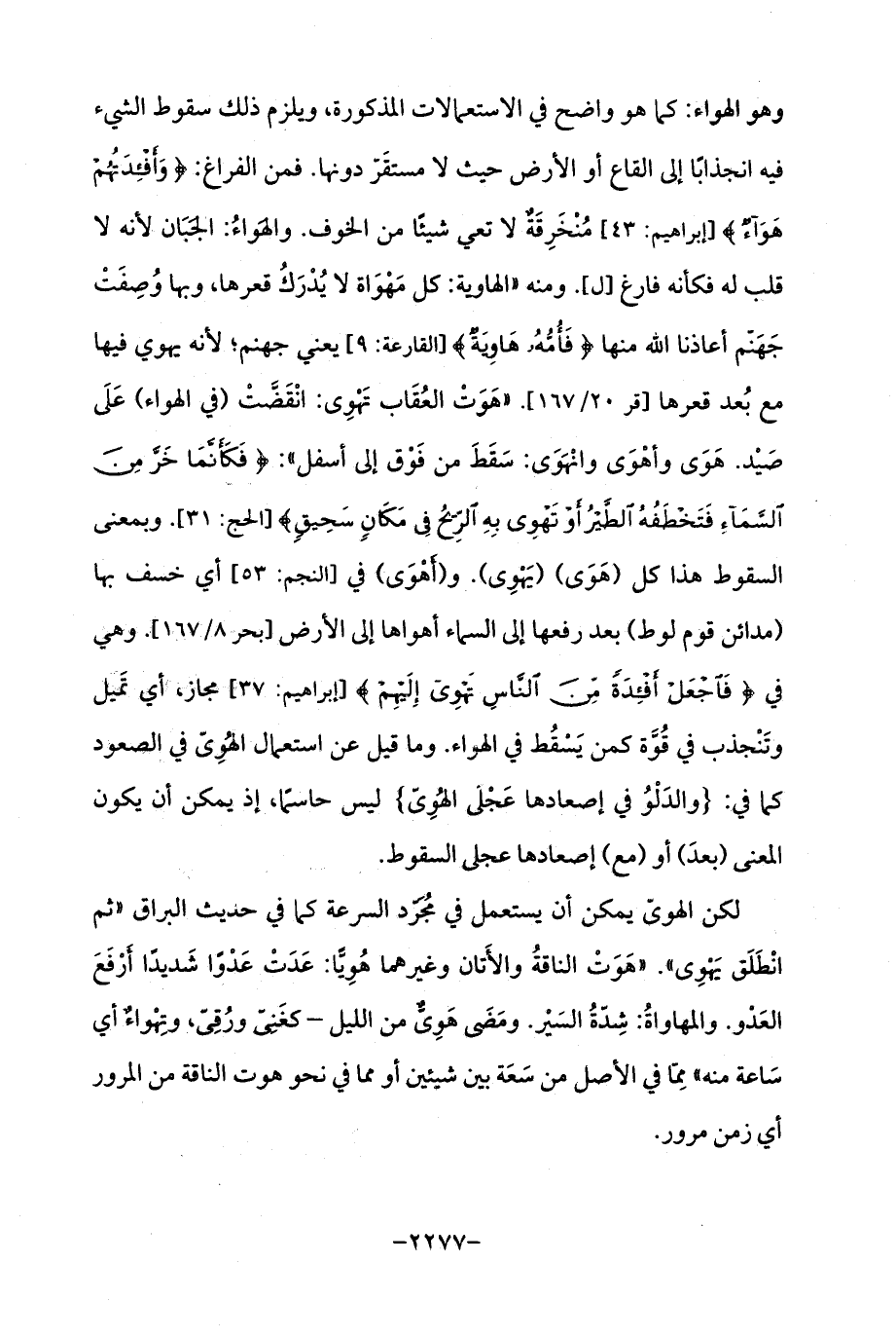 وهو الهواء: كما هو واضح في الاستعمالات المذكورة، ويلزم ذلك سقوط الشيء فيه انجذابًا إلى القاع أو الأرض حيث لا مستقَرّ دونها. فمن الفراغ: {وَأَفْئِدَتُهُمْ هَوَاءٌ} [إبراهيم: 43] مُنخَرِقَةٌ لا تعي شيئًا من الخوف. والهَواءُ: الجَبَان لأنه لا قلب له فكأنه فارغ [ل]. ومنه "الهاوية: كل مَهْوَاة لا يُدْرَكُ قعرها، وبها وُصِفَتْ جَهَنّم أعاذنا الله منها {فَأُمُّهُ هَاويَةٌ} [القارعة: 9] يعني جهنم؛ لأنه يهوي فيها مع بُعد قعرها [قر 20/ 167]. "هَوَتْ العُقَاب تَهْوى: انْقَضَّتْ (في الهواء) عَلَى صَيْد. هَوَى وأهْوَى وانْهَوَى: سَقَطَ من فَوْق إلى أسفل ": {فَكَأَنَّمَا خَرَّ مِنَ السَّمَاءِ فَتَخْطَفُهُ الطَّيرُ أَوْ تَهْوي بِهِ الرِّيحُ فِي مَكَانٍ سَحِيقٍ} [الحج: 31]. وبمعنى السقوط هذا كل (هَوَى) (يَهْوى). و (أهْوَى) في [النجم: 53] أي خسف بها (مدائن قوم لوط) بعد رفعها إلى السماء أهواها إلى الأرض [بحر 8/ 167]. وهي في {فَاجْعَلْ أَفْئِدَةً مِنَ النَّاسِ تَهْوي إِلَيهِمْ} [إبراهيم: 37] مجاز، أي تَميل وتَنْجذب في قُوَّة كمن يَسْقُط في الهواء. وما قيل عن استعمال الهُويّ في الصعود كما في: {والدَلْوُ في إصعادها عَجْلى الهُويّ} ليس حاسمًا، إذ يمكن أن يكون المعنى (بعدَ) أو (مع) إصعادها عجلى السقوط.