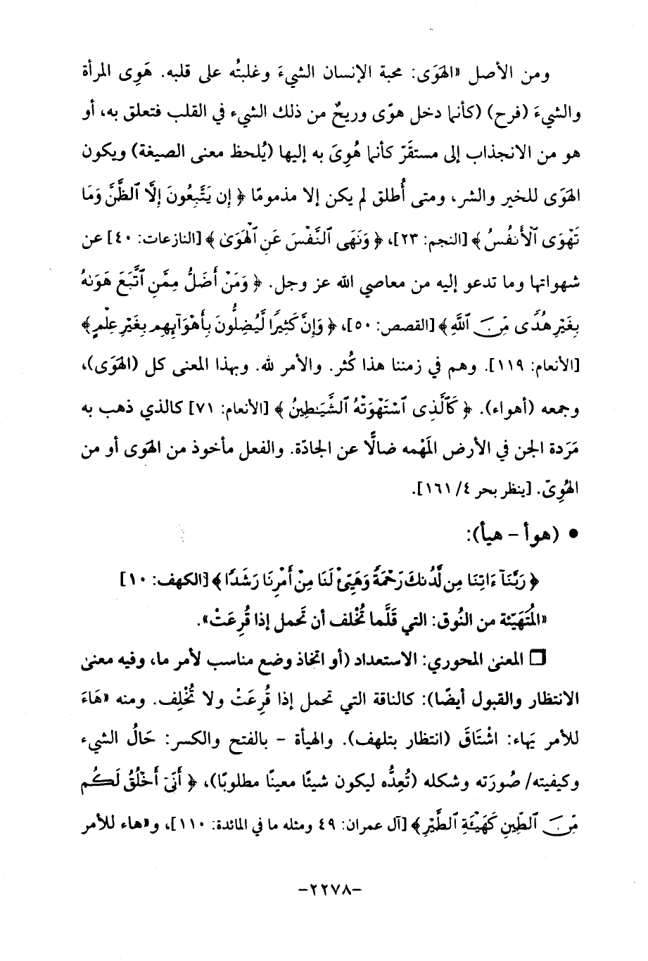 ومن الأصل "الهَوَى: محبة الإنسان الشيءَ وغلبتُه على قلبه. هَوِي المرأة والشيءَ (فرح) (كأنما دخل هوّى وريحٌ من ذلك الشيء في القلب فتعلق به، أو هو من الانجذاب إلى مستقَرّ كأنما هُوى به إليها (يُلحظ معنى الصيغة) ويكون الهَوَى للخير والشر، ومتى أُطلق لم يكن إلا مذمومًا {إِنْ يَتَّبِعُونَ إلا الظَّنَّ وَمَا تَهْوَى الْأَنْفُسُ} [النجم: 23]، {وَنَهَى النَّفْسَ عَنِ الْهَوَى} [النازعات: 40] عن شهواتها وما تدعو إليه من معاصي الله عزَّ وجلَّ. {وَمَنْ أَضَلُّ مِمَّنِ اتَّبَعَ هَوَاهُ بِغَيرِ هُدًى مِنَ اللَّهِ} [القصص: 50]، {وَإِنَّ كَثِيرًا لَيُضِلُّونَ بِأَهْوَائِهِمْ بِغَيرِ عِلْمٍ} [الأنعام: 119]. وهم في زمننا هذا كُثر. والأمر لله. وبهذا المعنى كل (الهَوَى)، وجمعه (أهواء). {كَالَّذِي اسْتَهْوَتْهُ الشَّيَاطِينُ} [الأنعام: 71] كالذي ذهب به مَرَدة الجن في الأرض المَهْمه ضالًّا عن الجادّة. والفعل مأخوذ من الهَوى أو من الهُويّ. [ينظر بحر 4/ 161].